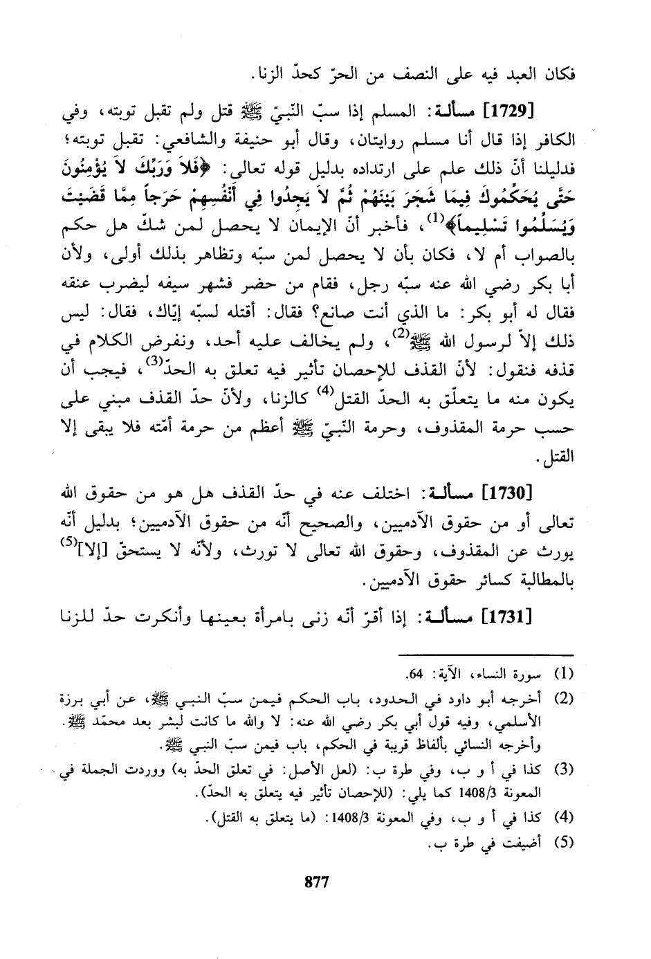 [1729] مسألة: المسلم إذا سب النبي صلى الله عليه وسلم قتل ولم تقبل توبته، وفي الكافر إذا قال أنا مسلم روايتان، وقال أبو حنيفة والشافعي: تقبل توبته؛ فدليلنا أنّ ذلك علم على ارتداده بدليل قوله تعالى: "فلا وربك لا يؤمنون حتى يحكموك فيما شجر بينهم ثم لا يجدوا في أنفسهم حرجاً مما قضيت ويسلموا تسليما"، فأخبر أن الإيمان لا يحصل لمن شك هل حكم بالصواب أم لا، فكان بأن لا يحصل لمن سبه وتظاهر بذلك أولى، ولأن أبا بكر رضي الله عنه سبه رجل، فقام من حضر فشهر سيفه ليضرب عنقه فقال له أبو بكر: ما الذي أنت صانع؟ فقال: أقتله لسبه إياك، فقال: ليس ذلك إلا لرسول الله صلى الله عليه وسلم، ولم يخالف عليه أحد، ونفرض الكلام في قذفه فنقول: لأن القذف للإحصان تأثير فيه تعلق به الحدّ، فيجب أن يكون منه ما يتعلّق به الحدّ القتل كالزنا، ولأن حدّ القذف مبني على حسب حرمة المقذوف، وحرمة النبي صلى الله عليه وسلم أعظم من حرمة أمته فلا يبقى إلا القتل.