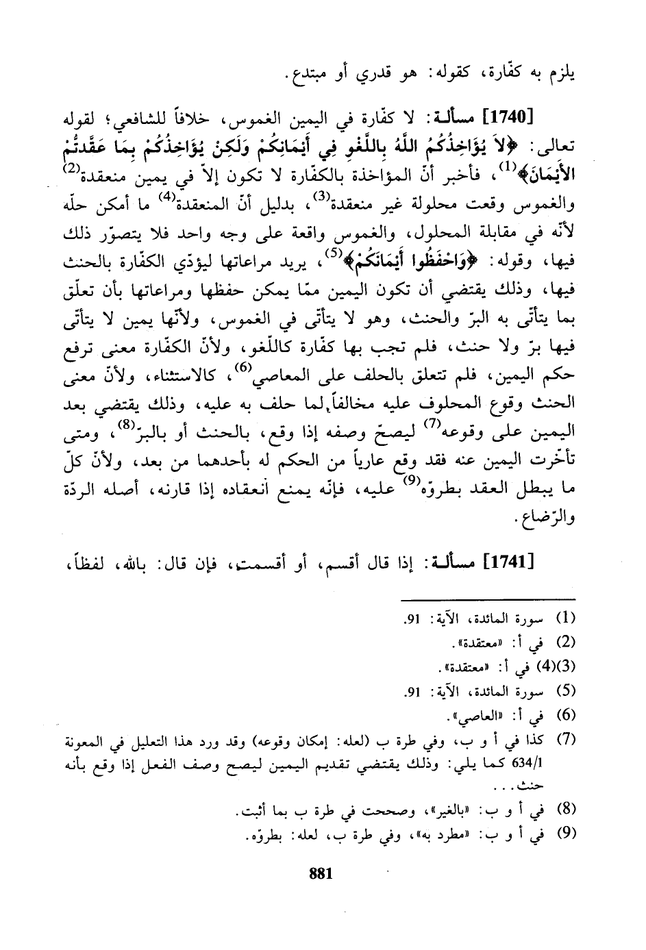 [1740] مسألة: لا كفارة في اليمين الغموس، خلافً للشافعي؛ لقوله تعالى: "لا يؤاخذكم الله باللغو في أيمانكم ولكن يؤاخذكم بما عقدتم الأيمان"، فأخبر أن المؤاخذة بالكفارة لا تكون إلا في يمين منعقدة والغموس وقعت محلولة غير منعقدة، بدليل أنّ المنعقدة ما أمكن حلّه لأنه في مقابلة المحلول، والغموس واقعة على وجه واحد فلا يتصور ذلك فيها، وقوله: "واحفظوا أيمانكم"، يريد مراعاتها ليؤدي الكفارة بالحنث فيها، وذلك يقتضى أن تكون اليمين ممّا يمكن حفظها ومراعاتها بأن تعلّق بما يتأتى به البرُّ والحنث، وهو لا يتأتى في الغموس، ولأنها يمين لا يتأتى فيها برٌّ ولا حنث، فلم تجب بها كفارة كاللّغو، ولأنّ الكفارة معنى ترفع حكم اليمين، فلم تتعلق بالحلف على المعاصي، كالاستثناء، ولأن معنى الحنث وقوع المحلوف عليه مخالفاً لما حلف به عليه، وذلك يقتضي بعد اليمين على وقوعه ليصحّ وصفه إذا وقع، بالحنث أو بالبرِّ، ومتى تأخرت اليمين عنه فقد وقع عارياً من الحكم له بأحدهما من بعد، ولأن كل ما يبطل العقد بطروه عليه، فإنه يمنع انعقاده إذا قارنه، أصله الردة والرضاع.