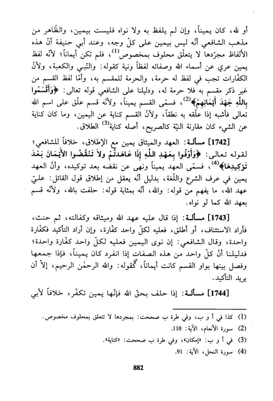 [1742] مسألة: العهد والميثاق يمين مع الإطلاق، خلافاً للشافعي؛ لقوله تعالى: "وأوفوا بعهد الله إذا عاهدتم ولا تنقضوا الأيمان بعد تؤكيده"، فسمى العهد يميناً ونهى عن نقضه بعد توكيده، وأن العهد يمين في عرف الشرع واللغة، بدليل أنه يعقل من إطلاق قول القائل: علي عهد الله، ما يفهم من قوله: والله، أنه بمثابة قوله: حلفت بالله، ولأنّه قسم بعهد الله كما لو نواه.