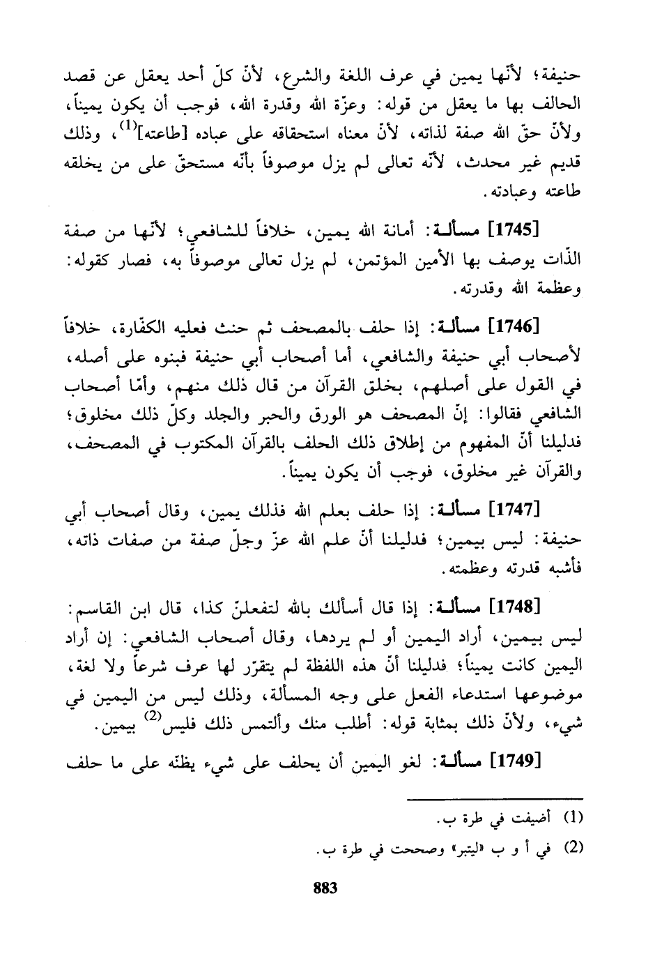 [1746] مسألة: إذا حلف بالمصحف ثم حنث فعليه الكفارة، خلافاً لأصحاب أبي حنيفة والشافعي، أما أصحاب أبي حنيفة فبنوه على أصله، في القول على أصلهم، بخلق القرآن من قال ذلك منهم، وأما أصحاب الشافعي فقالوا: إن المصحف هو الورق والحبر والجلد وكل ذلك مخلوق؛ فدليلنا أن المفهوم من إطلاق ذلك الحلف بالقرآن المكتوب في المصحف، والقرآن غير مخلوق، فوجب أن يكون يميناً.
