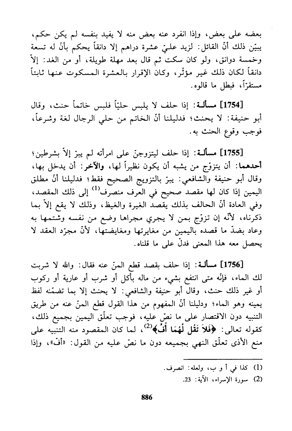 [1756] مسألة: إذا حلف بقصد قطع المن عنه فقال: والله لا شربت لك الماء، فإنه متى انتفع بشيء من ماله بأكل أو شرب أو عارية أو ركوب أو غير ذلك حنث، وقال أبو حنيفة والشافعي: لا يحنث إلا بما تضمنه لفظ يمينه وهو الماء؛ ودليلنا أن المفهوم من هذا القول قطع المن عنه من طريق التنبيه دون الاقتصار على ما نص عليه، فوجب تعلّق اليمين بجميع ذلك، كقوله تعالى: "فلا تقل لهما أف"، لما كان المقصود منه التنبيه على منع الأذى تعلّق النهي بجميعه دون ما نص عليه من القول: «أف»، وإذا