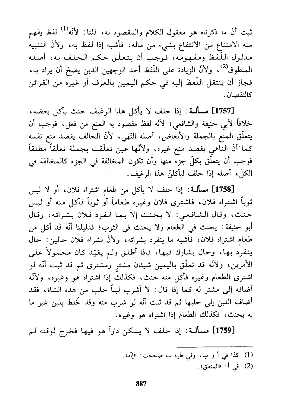 [1758] مسألة: إذا حلف لا يأكل من طعام اشتراه فلان، أو لا لبس ثوباً اشتراه فلان، فاشترى فلان وغيره طعاماً أو ثوباً فأكل منه أو لبس حنث، وقال الشافعي: لا يحنث إلا بما انفرد فلان بشرائه، وقال أبو حنيفة: يحنث في الطعام ولا يحنث في الثوب؛ فدليلنا أنه قد أكل من طعام اشتراه فلان، فأشبه ما ينفرد بشرائه، ولأن لشراء فلان حالين: حال ينفرد بها، وحال يشارك فيها، فإذا أطلق ولم يقيد كان محمولاً على الأمرين، ولأنّه قد تعلّق باليمين شيئان مشترٍ ومشترى ثم قد ثبت أنه لو اشترى الطعام وغيره فأكل منه حنث، فكذلك إذا اشتراه هو وغيره، ولأنّه أضافه إلى مشتر له كما إذا قال: لا أشرب لبناً حلب من هذه الشاة، فقد أضاف اللبن إلى حلبها ثم قد ثبت أنه لو شرب منه وقد خلط بلبن غير ما به يحنث، فكذلك الطعام إذا اشتراه هو وغيره.