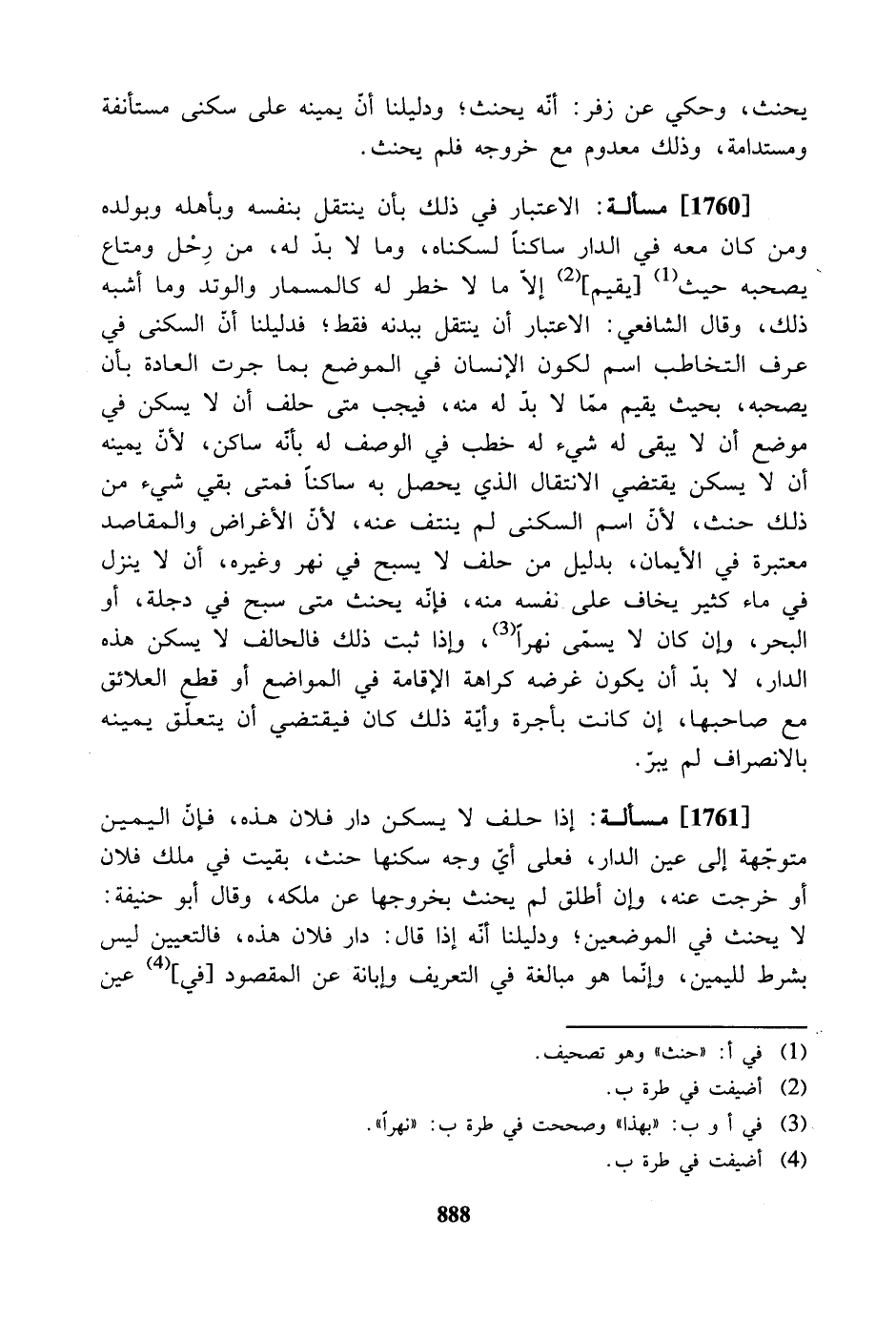 ومن كان معه في الدار ساكناً لسكناه، وما لا بدّ له، من رحل ومتاع يصحبه حيث [يقيم] إلا ما لا خطر له كالمسمار والوتد وما أشبه ذلك، وقالى الشافعي: الاعتبار أن ينتقل ببدنه فقط؛ فدليلنا أن السكنى في عرف التخاطب اسم لكون الإنسان في الموضع بما جرت العادة بأن يصحبه، بحيث يقيم ممّا لا بد له منه، فيجب متى حلف أن لايسكن في موضع أن لا يبقى له شيء له خطب في الوصف له بأنّه ساكن، لأن يمينه أن لا يسكن يقتضي الانتقال الذي يحصل به ساكناً فمتى بقي شيء من ذلك حنث، لأن اسم السكنى لم ينتف عنه، لأنّ الأغراض والمقاصد معتبرة في الأيمان، بدليل من حلف لا يسبح في نهر وغيره، أن لا ينزل في ماء كثير يخاف على نفسه منه، فإنّه يحنث متى سبح في دجلة، أو البحر، وإن كان لا يسمّى نهراً، وإذا ثبت ذلك فالحالف لا يسكن هذه الدار، لا بدّ أن يكون غرضه كراهة الإقامة في المواضع أو قطع العلائق مع صاحبها، إن كانت بأجرة وأية ذلك كان فيقتضي أن يتعلق يمينه بالانصراف لم يبر.