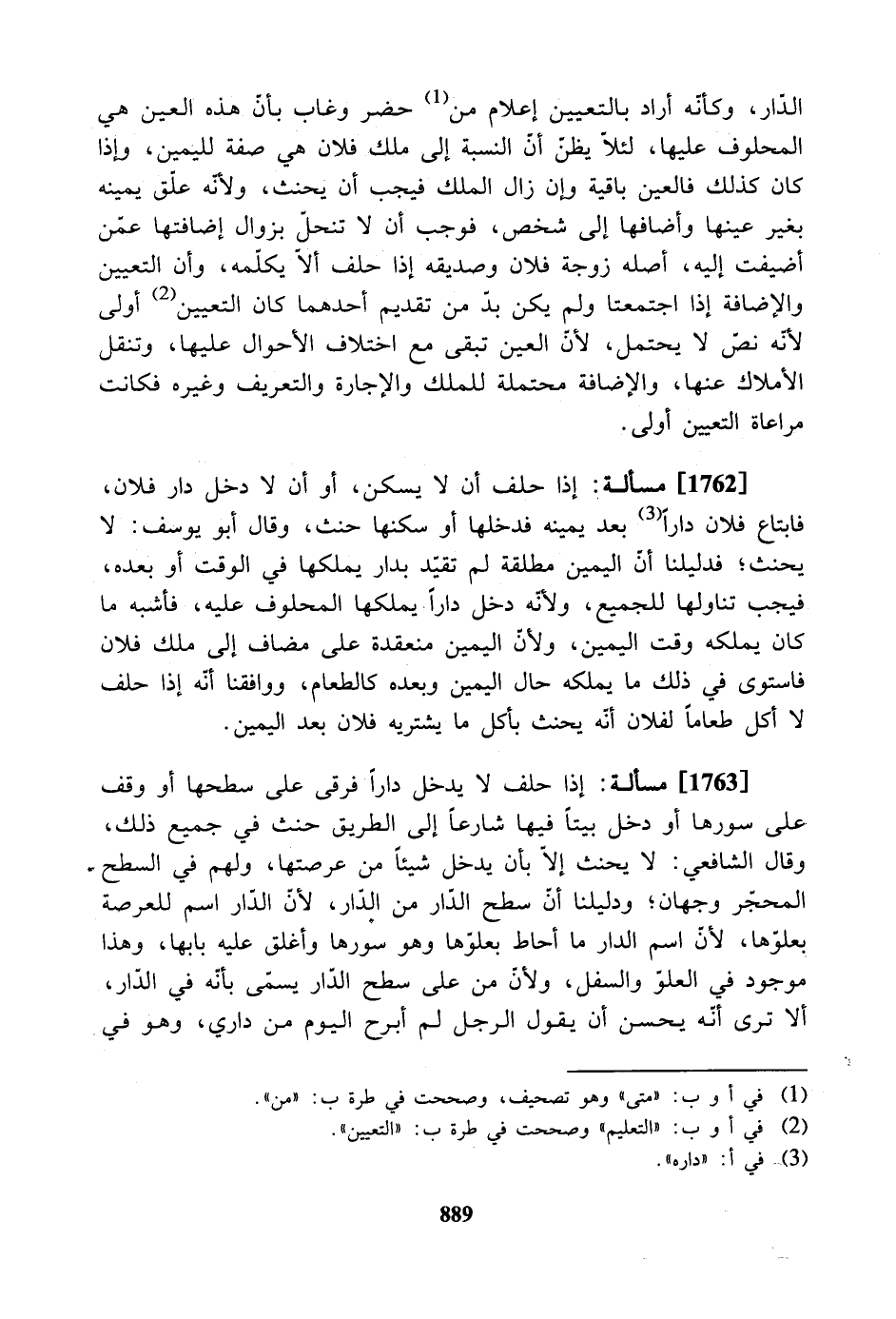 الدّار، وكأنه أراد بالتعيين إعلام من حضر وغاب بأن هذه العين هي المحلوف عليها، لئلا يظن أن النسبة إلى ملك فلان هي صفة لليمين، وإذا كان كذلك فالعين باقية وإن زال الملك فيجب أن يحنث، ولأنه علّق يمينه بغير عينها وأضافها إلى شخص، فوجب أن لا تنحل بزوال إضافتها عمّن أضيفت إليه، أصله زوجة فلان وصديقه إذا حلف ألا يكلّمه، وأن التعيين والإضافة إذا اجتمعتا ولم يكن بدّ من تقديم أحدهما كان التعيين أولى لأنّه نص لا يحتمل، لأنّ العين تبقى مع اختلاف الأحوال عليها، وتنقل الأملاك عنها، والإضافة محتملة للملك والإجارة والتعريف وغيره فكانت مراعاة التعيين أولى.