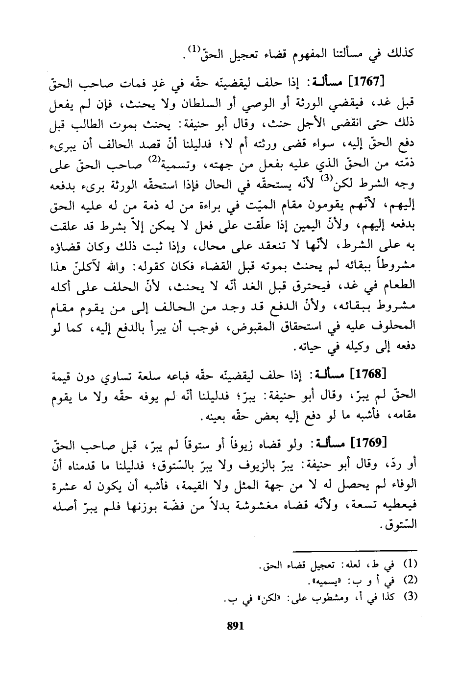 [1767] مسألة: إذا حلف ليقضينه حقه في غد فمات صاحب الحق قبل غد، فيقضي الورثة أو الوصي أو السلطان ولا يحنث، فإن لم يفعل ذلك حتى انقضى الأجل حنث، وقال أبو حنيفة: يحنث بموت الطالب قبل دفع الحق إليه، سواء قضى ورثته أم لا؛ فدليلنا أن قصد الحالف أن يبرىء ذمته من الحق الذي عليه بفعل من جهته، وتسمية صاحب الحق على وجه الشرط لكن لأنه يستحقه في الحال فإذا استحقه الورثة برىء بدفعه إليهم، لأنهم يقومون مقام الميت في براءة من له ذمة من له عليه الحق بدفعه إليهم، ولأن اليمين إذا علقت على فعل لا يمكن إلا بشرط قد علقت به على الشرط، لأنها لا تنعقد على محال، وإذا ثبت ذلك وكان قضاؤه مشروطاً ببقائه لم يحنث بموته قبل القضاء فكان كقوله: والله لآكلنَّ هذا الطعام في غد، فيحترق قبل الغد أنه لا يحنث، لأنّ الحلف على أكله مشروط ببقائه، ولأن الدفع قد وجد من الحالف إلى من يقوم مقام المحلوف عليه في استحقاق المقبوض، فوجب أن يبرأ بالدفع إليه، كما لو دفعه إلى وكيله في حياته.
