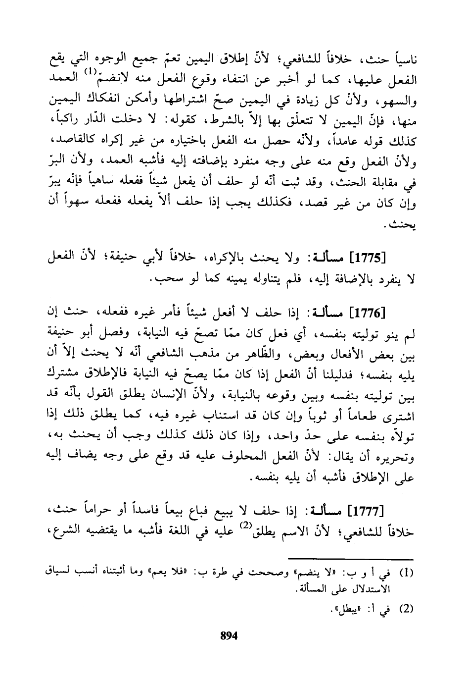 [1776] مسألة: إذا حلف لا أفعل شيئاً فأمر غيره ففعله، حنث إن لم ينو توليته بنفسه، أي فعل كان ممّا تصحّ فيه النيابة، وفصل أبو حنيفة بين بعض الأفعال وبعض، والظاهر من مذهب الشافعي أنّه لا يحنث إلا أن يليه بنفسه؛ فدليلنا أن الفعل إذا كان ممّا يصحّ فيه النيابة فالإطلاق مشترك بين توليته بنفسه وبين وقوعه بالنيابة، ولأنّ الإنسان يطلق القول بأنه قد اشترى طعاماً أو ثوباً وإن كان قد استناب غيره فيه، كما يطلق ذلك إذا تولاه بنفسه على حدّ واحد، وإذا كان ذلك كذلك وجب أن يحنث به، وتحريره أن يقال: لأن الفعل المحلوف عليه قد وقع على وجه يضاف إليه على الإطلاق فأشبه أن يليه بنفسه.