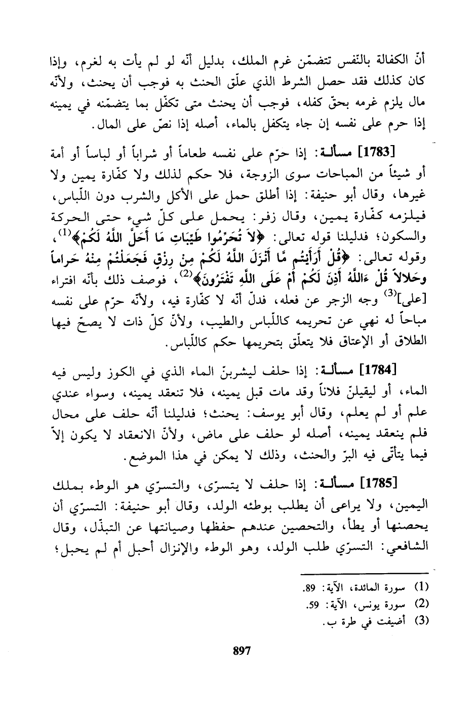 [1783] مسألة: إذا حرَّم على نفسه طعاماً أو شراباً أو لباساً أو أمة أو شيئاً من المباحات سوى الزوجة، فلا حكم لذلك ولا كفارة يمين ولا غيرها، وقال أبو حنيفة: إذا أطلق حمل على الأكل والشرب دون اللّباس، فيلزمه كفارة يمين، وقال زفر: يحمل على كل شيء حتى الحركة والسكون؛ فدليلنا قوله تعالى: "لا تحرموا طيبات ما أحل الله لكم"، وقوله تعالى: "قل أرأيتم ما أنزل الله لكم من رزق فجعلتم منه حراماً وحلالاً قل ءالله أذن لكم أم على الله تفترون"، فوصف ذلك بأنه افتراء [على] وجه الزجر عن فعله، فدل أنه لا كفارة فيه، ولأنه حرم على نفسه مباحاً له نهي عن تحريمه كاللّباس والطيب، ولأن كل ذات لا يصحّ فيها الطلاق أو الإعتاق فلا يتعلق بتحريمها حُكْمٌ كاللّباس.