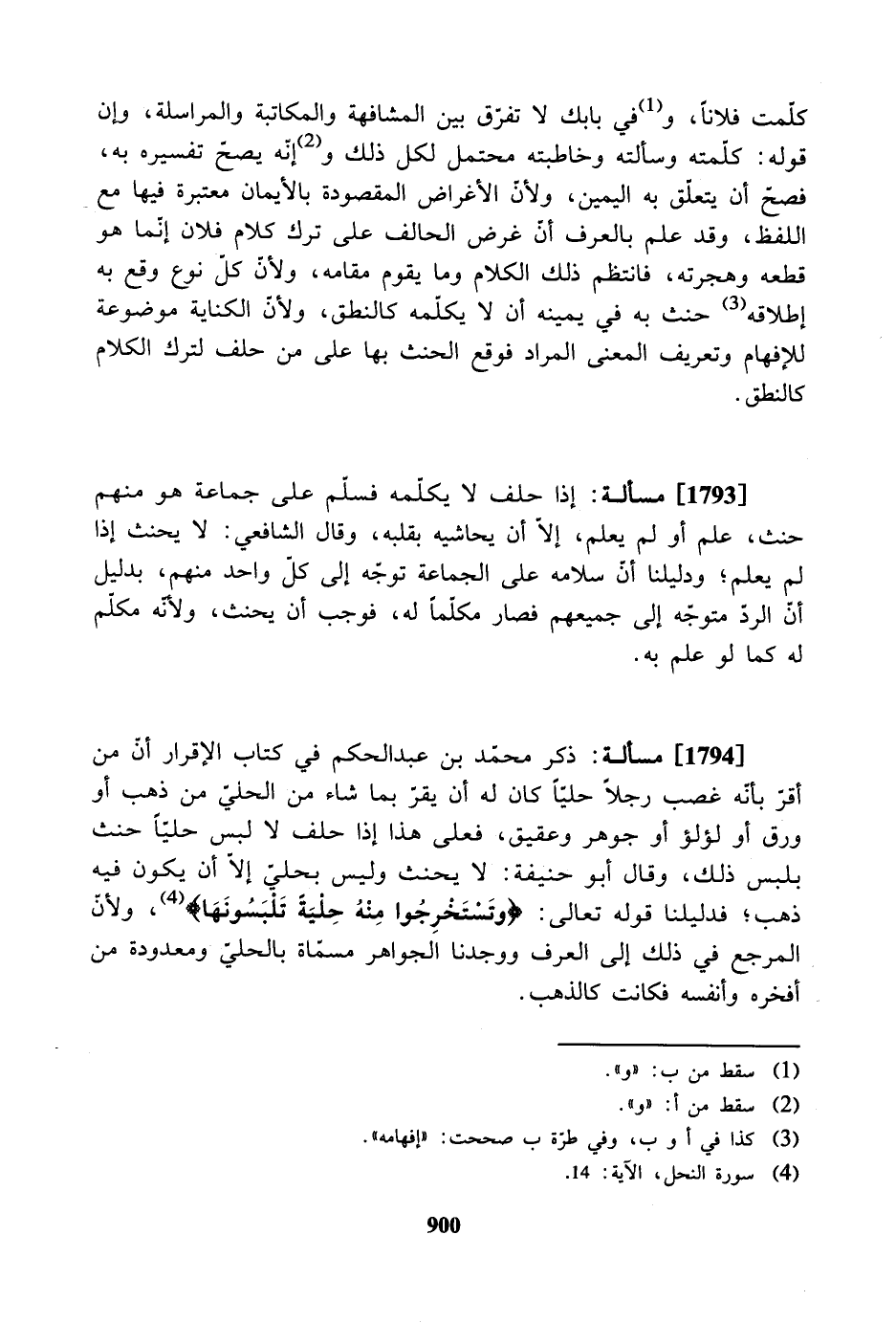 كلمت فلاناً، وفي بابك لا تفرق بين المشافهة والمكاتبة والمراسلة، وإن قوله: كلّمته وسألته وخاطبته محتمل لكل ذلك وإنه يصحّ تفسيره به، فصحّ أن يتعلق به اليمين، ولأن الأغراض المقصودة بالأيمان معتبرة فيها مع اللفظ، وقد علم بالعرف أن غرض الحالف على ترك كلام فلان إنما هو قطعه وهجرته، فانتظم ذلك الكلام وما يقوم مقامه، ولأن كل نوع وقع به إطلاقه حنث به في يمينه أن لا يكلمه كالنطق، ولأن الكناية موضوعة للإفهام وتعريف المعنى المراد فوقع الحنث بها على من حلف لترك الكلام كالنطق.