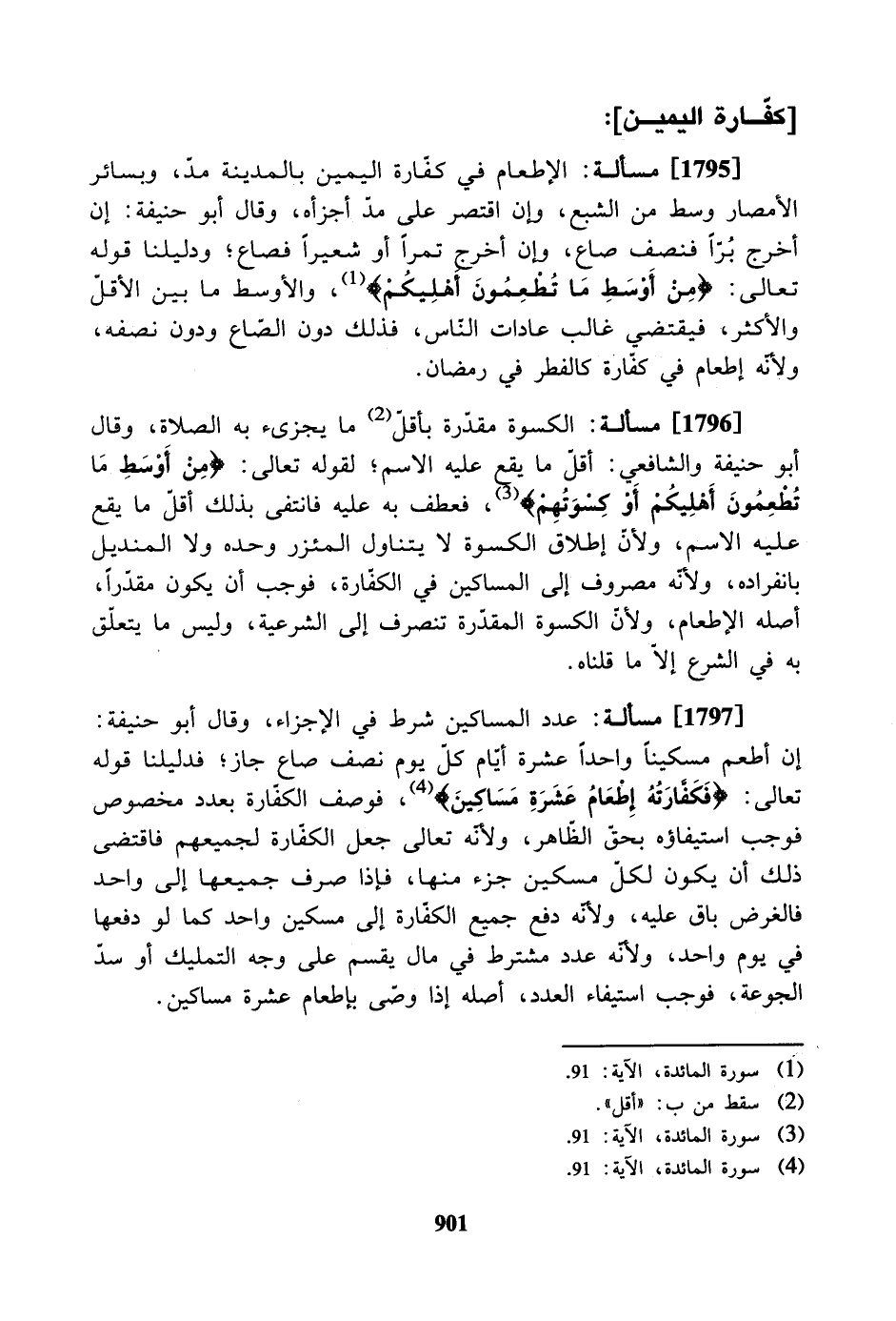 [1795] مسألة: الإطعام في كفارة اليمين بالمدينة مد، وبسائر الأمصار وسط من الشبع، وإن اقتصر على مدّ أجزاه، وقال أبو حنيفة: إن أخرج برًا فنصف صاع، وإن أخرج تمرًا أو شعيرًا فصاع؛ ودليلنا قوله تعالى: "من أوسط ما تطعمون أهليكم"، والأوسط ما بين الأقل والأكثر، فيقتضي غالب عادات الناس، فذلك دون الصاع ودون نصفه، ولأنه إطعام في كفارة كالفطر في رمضان.