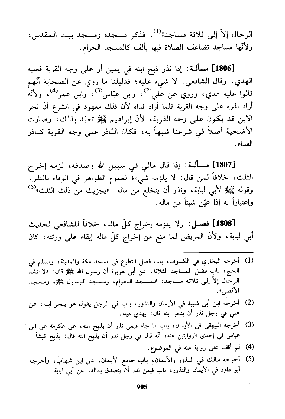 [1806] مسألة: إذا نذر ذبح ابنه في يمين أو على وجه القربة فعليه الهدي، وقال الشافعي: لا شيء عليه؛ فدليلنا ماروي عن الصحابة أنهم قالوا عليه هدي، وروي عن علي، وابن عباس، وابن عمر، ولأنه أراد نذره على وجه القربة فلما أراد فداه لأن ذلك معهود في الشرع أن نحر الابن قد يكون على وجه القربة، لأن إبراهيم صلى الله عليه وسلم تعبد بذلك، وصارت الأضحية أصلاً في شرعنا شبهًا به، فكان النّاذر على وجه القربة كناذر الفداء.