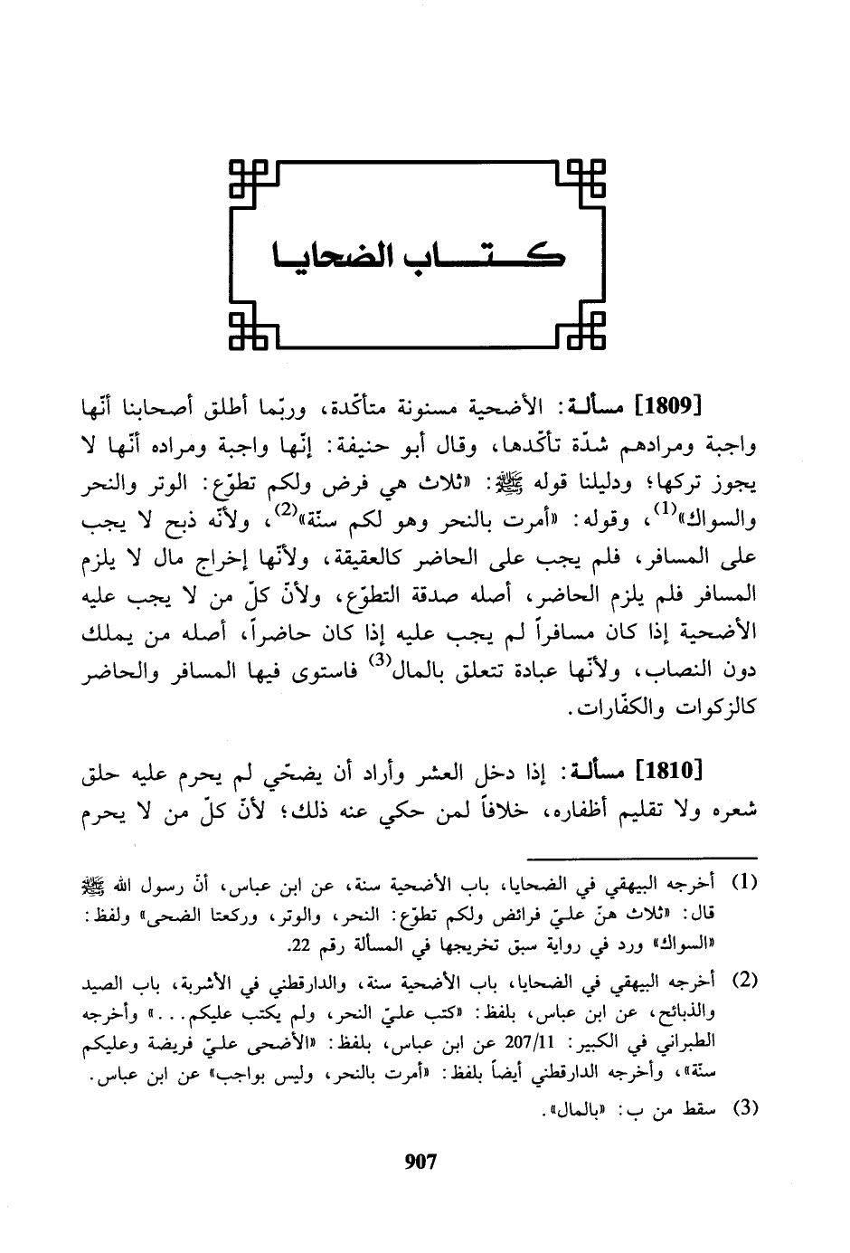 [1809] مسألة: الأضحية مسنونة متأكدة، وربما أطلق أصحابنا أنها واجبة ومرادهم شدّة تأكدها، وقال أبو حنيفة: إنّها واجبة ومراده أنّها لا يجوز تركها؛ ودليلنا قوله صلى الله عليه وسلم: «ثلاث هي فرض ولكم تطوع: الوتر والنحر والسواك»، وقوله: «أمرت بالنحر وهو لكم سنة»، ولأنه ذبح لا يجب على المسافر، فلم يجب على الحاضر كالعقيقة، ولأنها إخراج مال لا يلزم المسافر فلم يلزم الحاضر، أصله صدقة التطوع، ولأن كل من لا يجب عليه الأضحية إذا كان مسافرًا لم يجب عليه إذا كان حاضرًا، أصله من يملك دون النصاب، ولأنّها عبادة تتعلق بالمال فاستوى فيها المسافر والحاضر كالزكوات والكفارات.