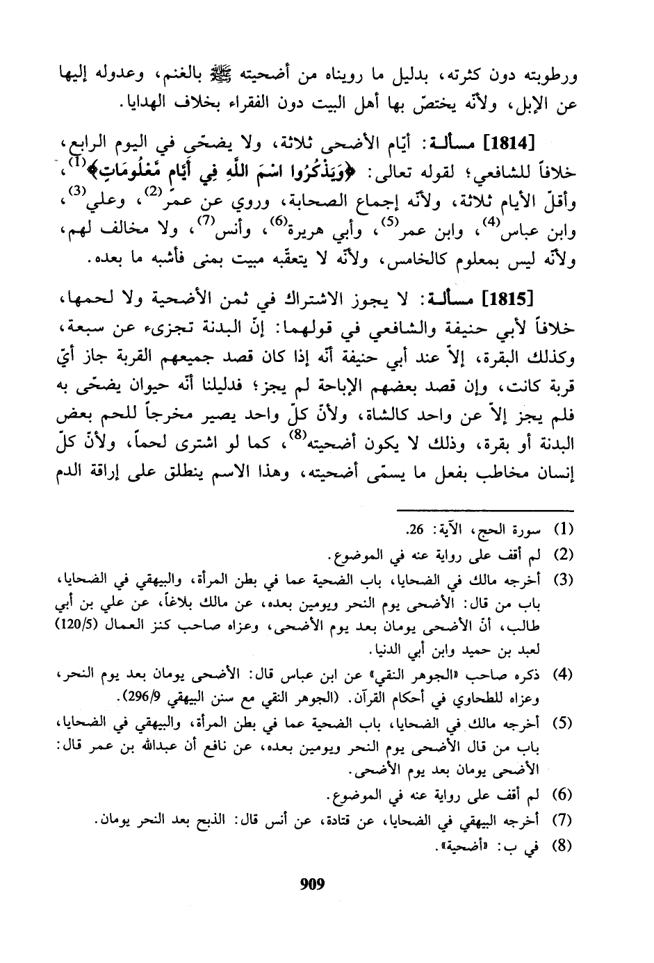 [1815] مسألة: لا يجوز الاشتراك في ثمن الأضحية ولا لحمها، خلافاً لأبي حنيفة والشافعي في قولهما: إن البدنة تجزىء عن سبعة، وكذلك البقرة، إلا عند أبي حنيفة أنه إذا كان قصد جميعهم القربة جاز أي قربة كانت، وإن قصد بعضهم الإباحة لم يجز؛ فدليلنا أنه حيوان يضحى به فلم يجز إلا عن واحد كالشاة، ولأن كل واحد يصير مخرجاً للحم بعض البدنة أو بقرة، وذلك لا يكون أضحيته، كما لو اشترى لحماً، ولأن كل إنسان مخاطب بفعل ما يسمّى أضحيته، وهذا الاسم ينطلق على إراقة الدم
