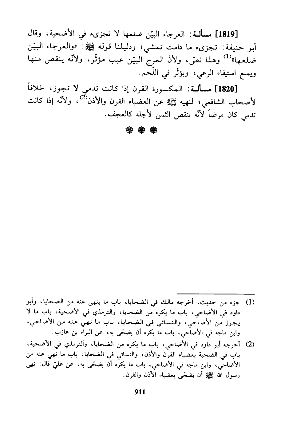 [1820] مسألة: المكسورة القرن إذا كانت تدمي لا تجوز، خلافاً لأصحاب الشافعي؛ لنهيه صلى الله عليه وسلم عن العضباء القرن والأذن، ولأنّه إذا كانت تدمي كان مرضاً لأنه ينقص الثمن لأجله كالعجف.