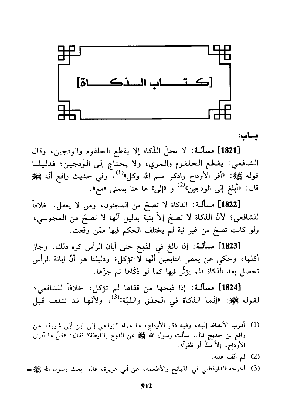 [1822] مسألة: الذكاة لا تصحّ من المجنون، ومن لا يعقل، خلافاً للشافعي؛ لأن الذكاة لا تصحّ إلا بنية بدليل أنها لا تصحّ من المجوسي، ولو كانت تصحّ من غير نية لم يختلف الحكم فيها ممّن وقعت.