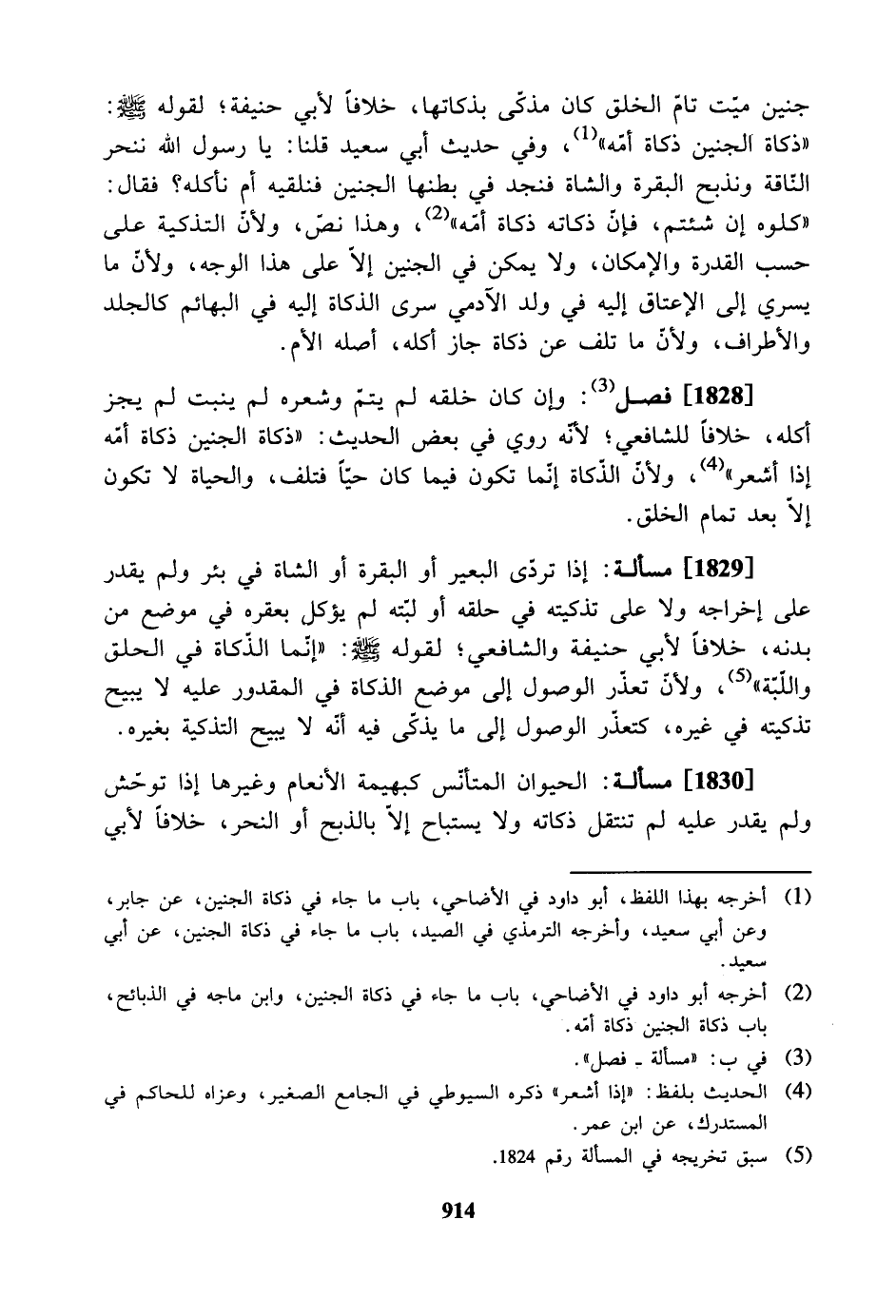 [1828] فصل: وإن كان خلقه لم يتم وشعره لم ينبت لم يجز أكله، خلافاً للشافعي؛ لأنه روي في بعض الحديث: «ذكاة الجنين ذكاة أمه إذا أشعر»، ولأن الذكاة إنما تكون فيما كان حياً فتلف، والحياة لا تكون إلا بعد تمام الخلق.