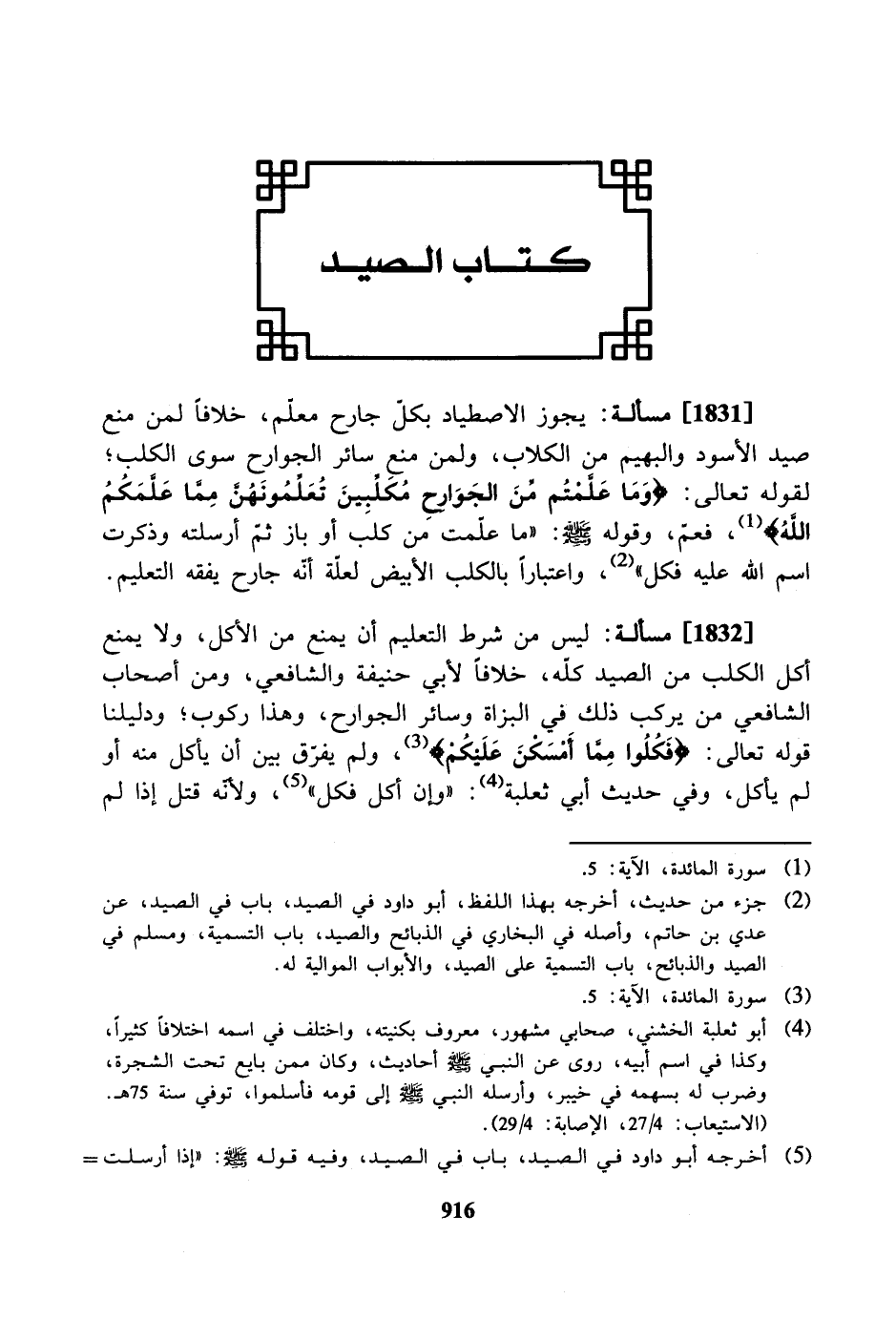 [1832] مسألة: ليس من شرط التعليم أن يمنع من الأكل، ولا يمنع أكل الكلب من الصيد كله، خلافاً لأبي حنيفة والشافعي، ومن أصحاب الشافعي من يركب ذلك في البزاة وسائر الجوارح، وهذا ركوب؛ ودليلنا قوله تعالى: "فكلوا مما أمسكن عليكم"، ولم يفرق بين أن يأكل منه أو لم يأكل، وفي حديث أبي ثعلبة: "وان أكل فكل"، ولأنّه قتل إذا لم