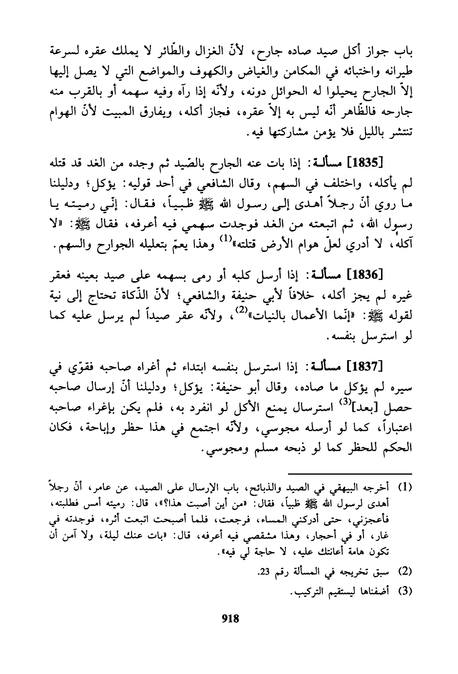 [1835] مسألة: إذا بات عنه الجارح بالصيد ثم وجده من الغد قد قتله لم يأكله، واختلف في السهم، وقال الشافعي في أحد قوليه: يؤكل؛ ودليلنا ما روي أن رجلاً أهدى إلى رسول الله صلى الله عليه وسلم ظبياً، فقال: إني رميته يا رسول الله، ثم اتبعته من الغد فوجدت سهمي فيه أعرفه، فقال صلى الله عليه وسلم: «لا آكله، لا أدري لعل هوام الأرض قتلته» وهذا يعم بتعليله الجوارح والسهم.