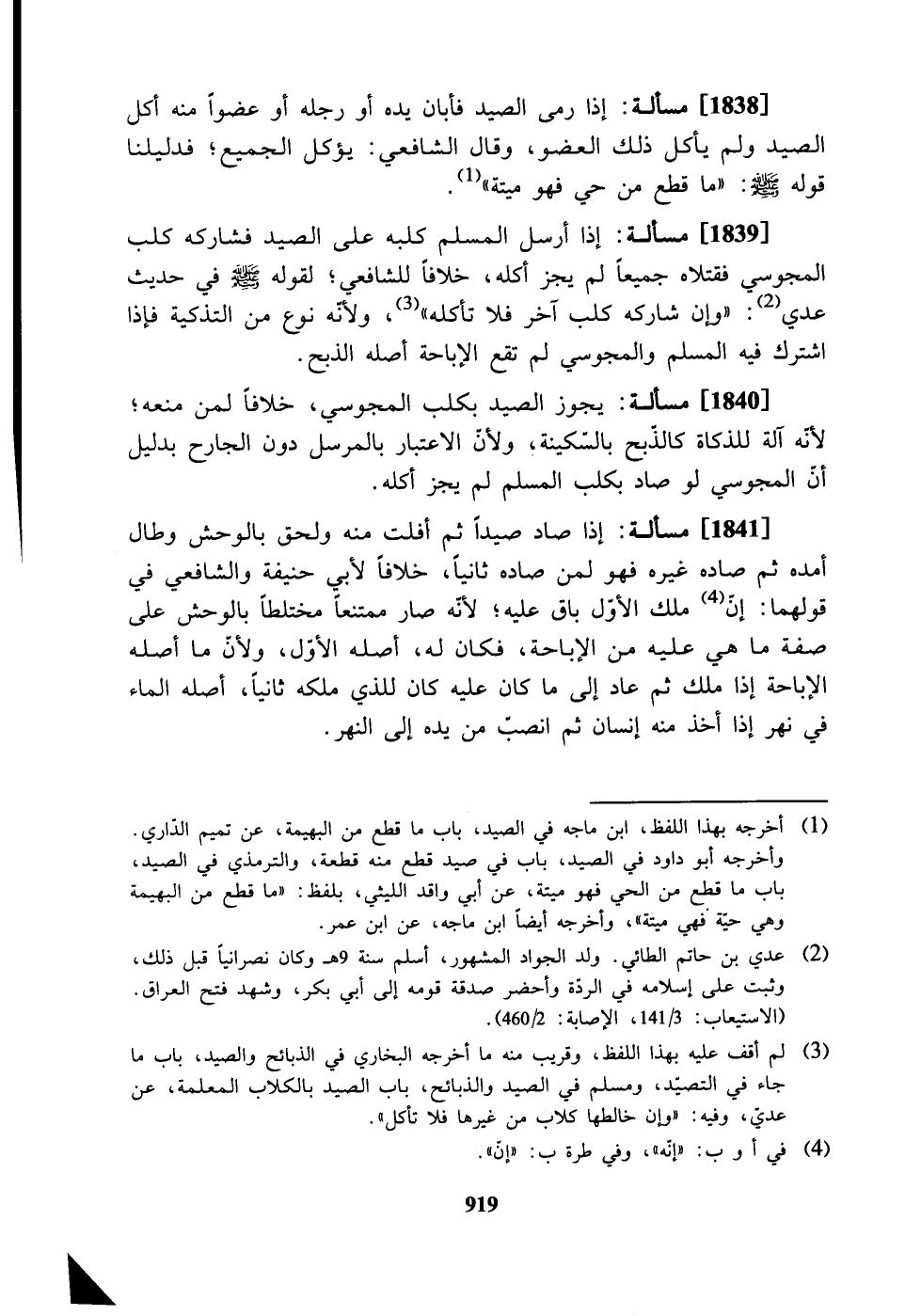 [1838] مسألة: إذا رمى الصيد فأبان يده أو رجله أو عضوًا منه أكل الصيد ولم يأكل ذلك العضو، وقال الشافعي: يؤكل الجميع؛ فدليلنا قوله صلى الله عليه وسلم: «ما قطع من حي فهو ميتة».