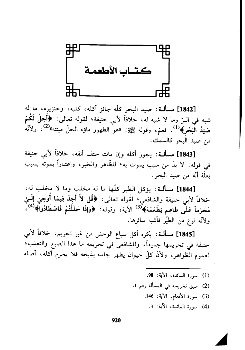 [1842] مسألة: صيد البحر كلّه جائز أكله، كلبه، وخنزيره، ما له شبه في البر وما لا شبه له، خلافاً لأبي حنيفة؛ لقوله تعالى: "أحل لكم صيد البحر"، فعم، وقوله صلى الله عليه وسلم: «هو الطهور ماؤه الحل ميتته»، ولأنه من صيد البحر كالسمك.