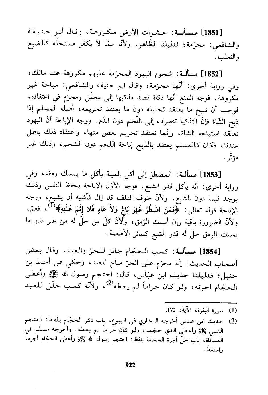 [1852] مسألة: شحوم اليهود المحرَّمة عليهم مكروهة عند مالك، وفي رواية أخرى: أنّها محرمة، وقال أبو حنيفة والشافعي: مباحة غير مكروهة.