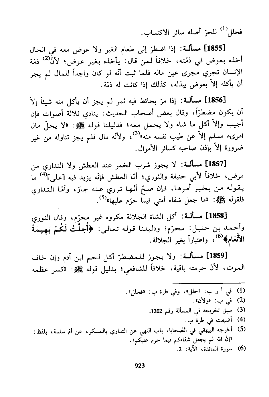 [1855] مسألة: إذا اضطر إلى طعام الغير ولا عوض معه في الحال أخذه بعوض في ذمته، خلافاً لمن قال: يأخذه بغير عوض؛ لأن ذمة الإنسان تجري مجرى عينِ ماله فلما ثبت أنه لو كان واجداً للمال لم يجز أن يأكله إلا بعوض يبذله، كذلك إذا كانت له ذمة.