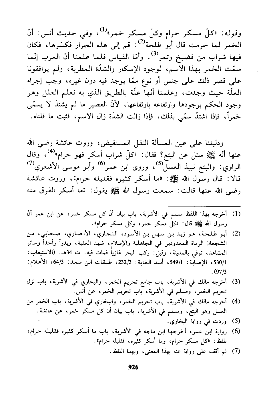 ودليلنا على عين المسألة النقل المستفيض، وروت عائشة رضي الله عنها أنّه صلى الله عليه وسلم سئل عن البتع؟ فقال: «كل شراب أسكر فهو حرام»، وقال الراوي: والبتع نبيذ العسل، وروى ابن عمر وأبو موسى الأشعري قالا: قال رسول الله صلى الله عليه وسلم: «ما أسكر كثيره فقليله حرام»، وروت عائشة رضي الله عنها قالت: سمعت رسول الله صلى الله عليه وسلم يقول: «ما أسكر الفرق منه