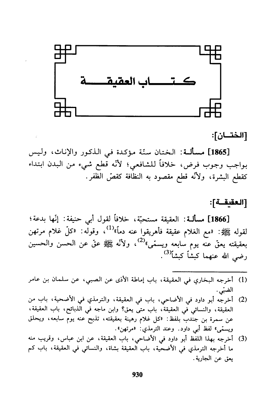 [1866] مسألة: العقيقة مستحبة، خلافاً لقول أبي حنيفة: إنّها بدعة!؛ لقوله صلى الله عليه وسلم: «مع الغلام عقيقة فأهريقوا عنه دمًا»، وقوله: «كل غلام مرتهن بعقيقته يعق عنه يوم سابعه ويسمى»، ولأنه صلى الله عليه وسلم عقَّ عن الحسن والحسين رضي الله عنهما كبشاً كبشاً.