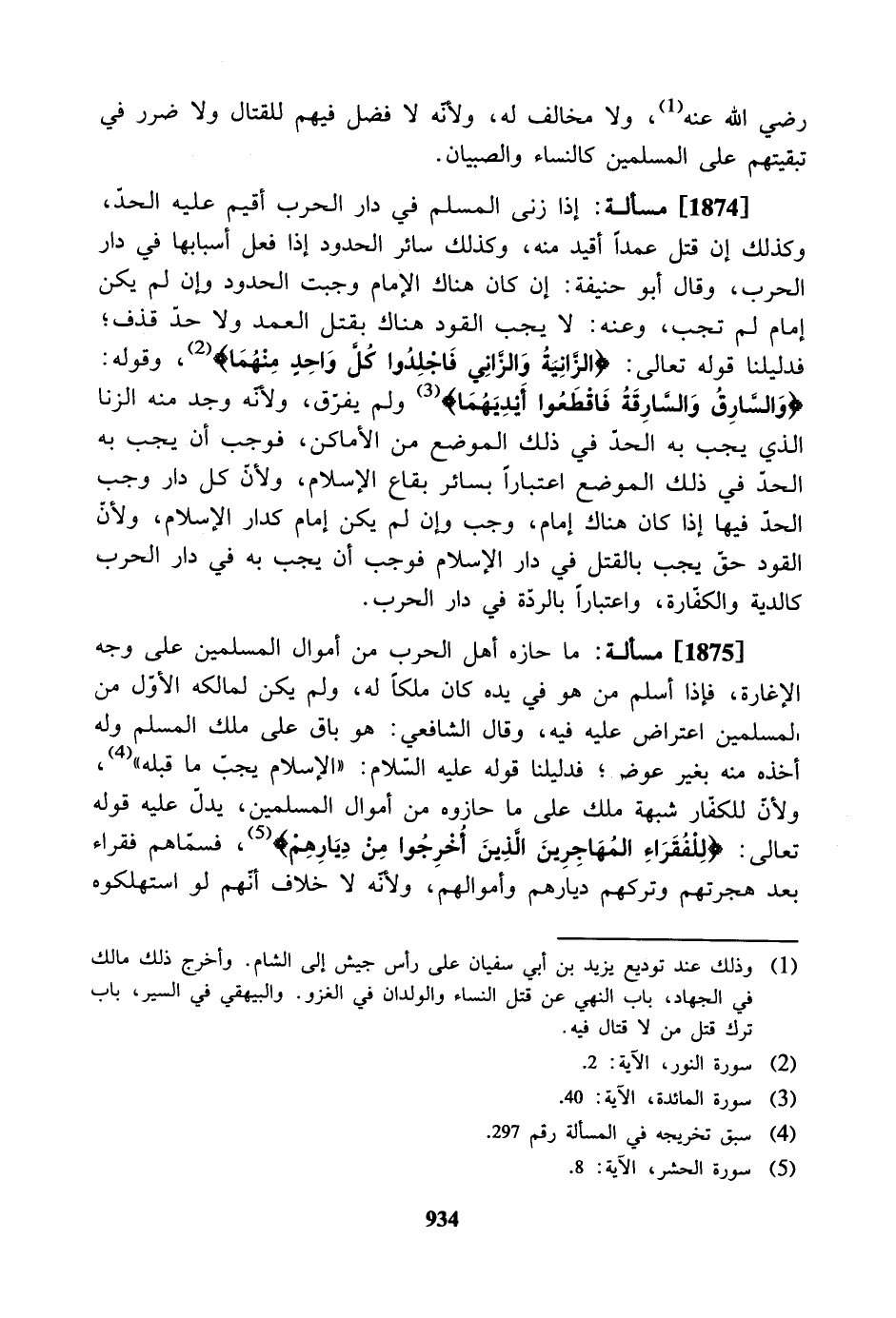 [1874] مسألة: إذا زنى المسلم في دار الحرب أقيم عليه الحد، وكذلك إن قتل عمدًا أقيد منه، وكذلك سائر الحدود إذا فعل أسبابها في دار الحرب، وقال أبو حنيفة: إن كان هناك الإمام وجبت الحدود وإن لم يكن إمام لم تجب، وعنه: لا يجب القود هناك بقتل العمد ولا حدّ قذف؛ فدليلنا قوله تعالى: "الزانية والزاني فاجلدوا كل واحد منهما"، وقوله: "والسارق والسّارقة فاقطعوا أيديهما" ولم يفرق، ولأنه وجد منه الزنا الذي يجب به الحدّ في ذلك الموضع من الأماكن، فوجب أن يجب به الحدّ في ذلك الموضع اعتبارًا بسائر بقاع الإسلام، ولأنّ كل دار وجب الحد فيها إذا كان هناك إمام، وجب وإن لم يكن إمام كدار الإسلام، ولأن القود حق يجب بالقتل في دار الإسلام فوجب أن يجب به في دار الحرب كالدية والكفارة، واعتبارًا بالردة في دار الحرب.