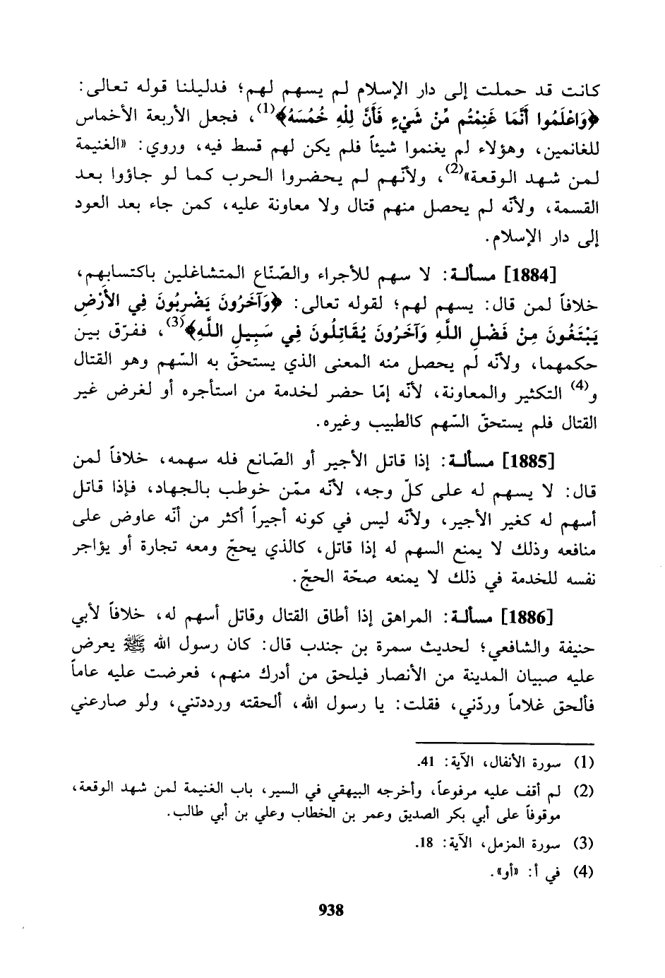 [1884] مسألة: لا سهم للأجراء والصناع المتشاغلين باكتسابهم، خلافاً لمن قال: يسهم لهم؛ لقوله تعالى: "وآخرون يضربون في الأرض يبتغون من فضل الله وآخرون يقاتلون في سبيل الله"، ففرق بين حكمهما، ولأنه لم يحصل منه المعنى الذي يستحق به السهم وهو القتال والتكثير والمعاونة، لأنه إما حضر لخدمة من استأجره أو لغرض غير القتال فلم يستحق السهم كالطبيب وغيره.