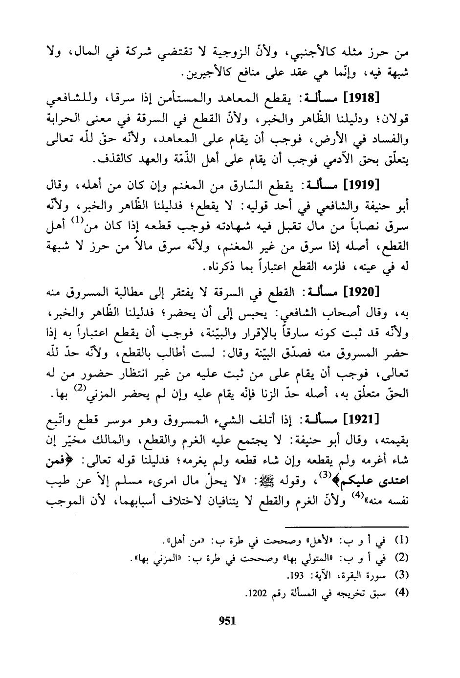 [1919] مسألة: يقطع السّارق من المغنم وإن كان من أهله، وقال أبو حنيفة والشافعي في أحد قوليه: لا يقطع؛ فدليلنا الظاهر والخبر، ولأنه سرق نصاباً من مال تقبل فيه شهادته فوجب قطعه إذا كان من أهل القطع، أصله إذا سرق من غير المغنم، ولأنه سرق مالاً من حرز لا شبهة له في عينه، فلزمه القطع اعتبارًا بما ذكرناه.
