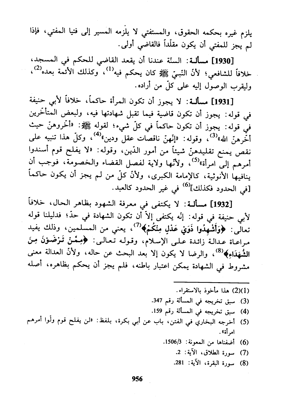 [1931] مسألة: لا يجوز أن تكون المرأة حاكمًا، خلافاً لأبي حنيفة في قوله: يجوز أن تكون قاضية فيما تقبل شهادتها فيه، ولبعض المتأخرين في قوله: يجوز أن تكون حاكماً في كل شيء؛ لقوله صلى الله عليه وسلم: «أخِّروهن حيث أخرهن الله»، وقوله: «إنهن ناقصات عقل ودين»، وكل هذا تنبيه على نقص يمنع تقليدهن شيئاً من أمور الدين، وقوله: «لا يفلح قوم أسندوا أمرهم إلى امرأة»، ولأنّها ولاية لفصل القضاء والخصومة، فوجب أن ينافيها الأنوثية، كالإمامة الكبرى، ولأن كل من لم يجز أن يكون حاكمًا [في الحدود فكذلك] في غير الحدود كالعبد.