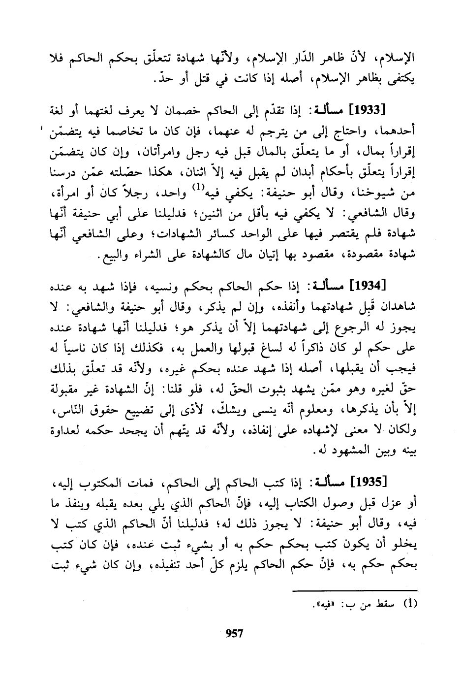 [1933] مسألة: إذا تقدم إلى الحاكم خصمان لا يعرف لغتهما أو لغة أحدهما، واحتاج إلى من يترجم له عنهما، فإن كان ما تخاصما فيه يتضمّن إقرارًا بمال، أو ما يتعلّق بالمال قبل فيه رجل وامرأتان، وإن كان يتضمن إقرارًا يتعلّق بأحكام أبدان لم يقبل فيه إلا اثنان، هكذا حصلته عمّن درسنا من شيوخنا، وقال أبو حنيفة: يكفي فيه واحد، رجلا ًكان أو امرأة، وقال الشافعي: لا يكفي فيه بأقل من اثنين؛ فدليلنا على أبي حنيفة أنها شهادة فلم يقتصر فيها على الواحد كسائر الشهادات؛ وعلى الشافعي أنّها شهادة مقصودة، مقصود بها إتيان مال كالشهادة على الشراء والبيع.