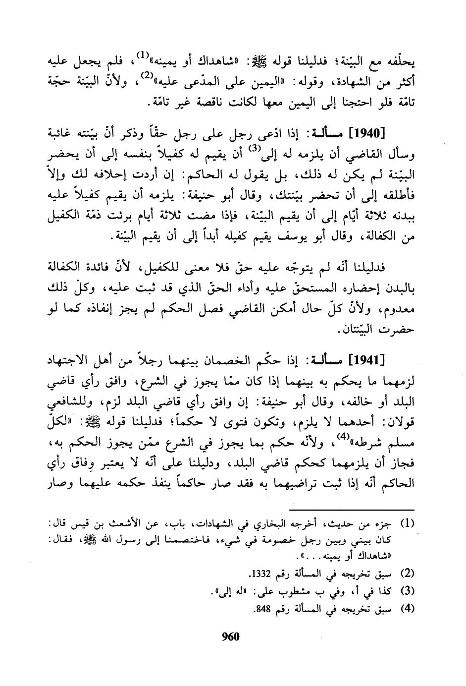 [1941] مسألة: إذا حكَّم الخصمان بينهما رجلاً من أهل الاجتهاد لزمهما ما يحكم به بينهما إذا كان مما يجوز في الشرع، وافق رأي قاضي البلد أو خالفه، وقال أبو حنيفة: إن وافق رأي قاضي البلد لزم، وللشافعي قولان: أحدهما لا يلزم، وتكون فتوى لا حكماً؛ فدليلنا قوله صلى الله عليه وسلم: «لكل مسلم شرطه»، ولأنه حكم بما يجوز في الشرع ممّن يجوز الحكم به، فجاز أن يلزمهما كحكم قاضي البلد، ودليلنا على أنّه لا يعتبر وفاق رأي الحاكم أنّه إذا ثبت تراضيهما به فقد صار حاكماً ينفذ حكمه عليهما وصار