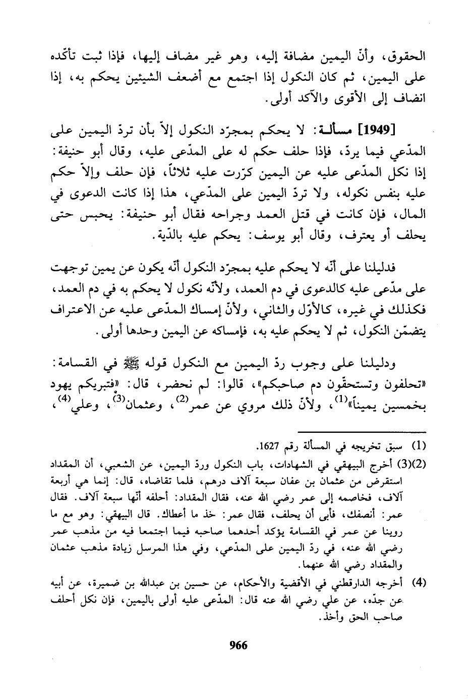 ودليلنا على وجوب رد اليمين مع النكول قوله صلى الله عليه وسلم في القسامة: «تحلفون وتستحقون دم صاحبكم»، قالوا: لم نحضر، قال: «فتبريكم يهود بخمسين يمينًا»، ولأن ذلك مروي عن عمر، وعثمان، وعلي،