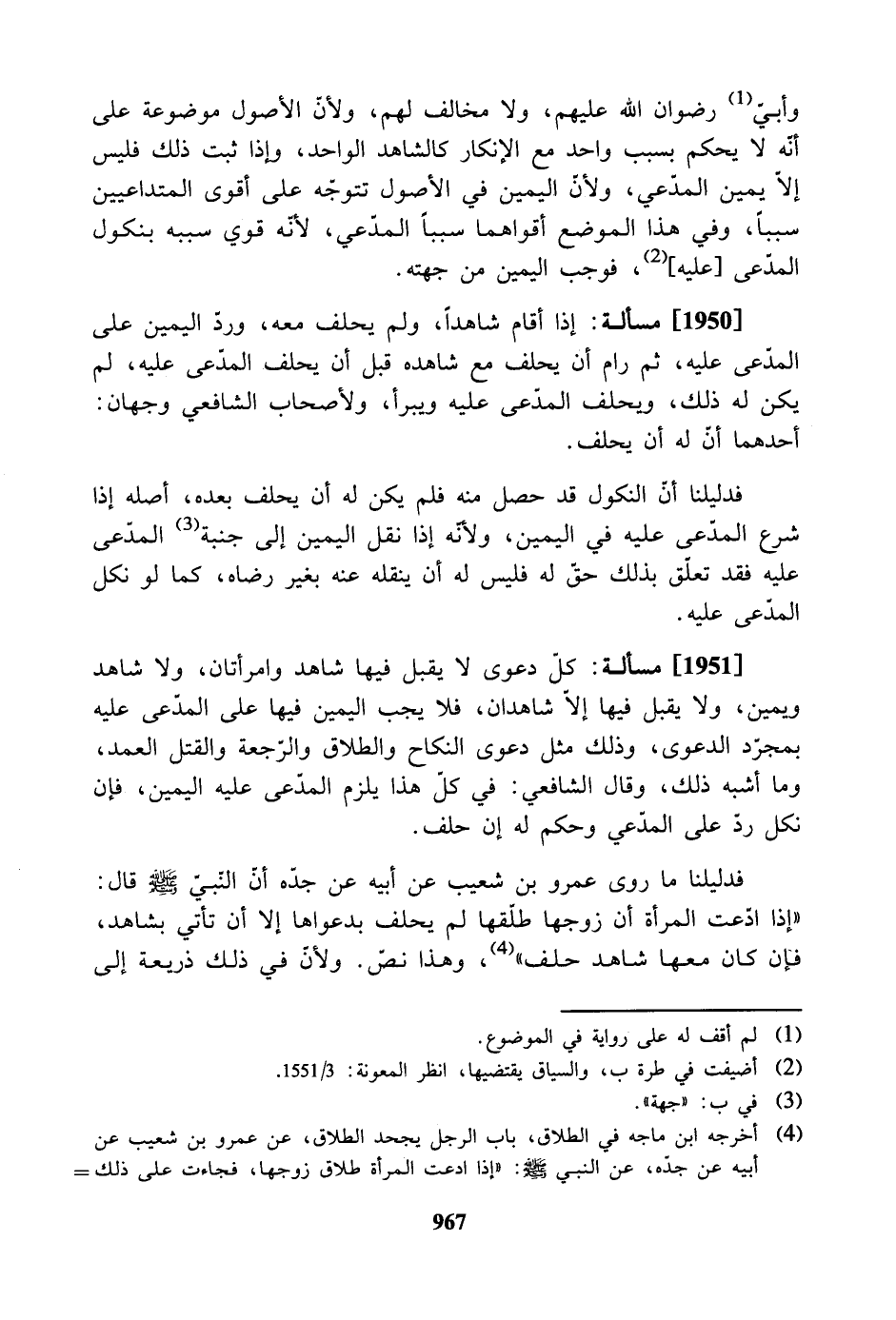 [1951] مسألة: كل دعوى لا يقبل فيها شاهد وامرأتان، ولا شاهد ويمين، ولا يقبل فيها إلا شاهدان، فلا يجب اليمين فيها على المدعى عليه بمجرد الدعوى، وذلك مثل دعوى النكاح والطلاق والرجعة والقتل العمد، وما أشبه ذلك، وقال الشافعي: في كل هذا يلزم المدّعى عليه اليمين، فإن نكل رد على المدعي وحكم له إن حلف.