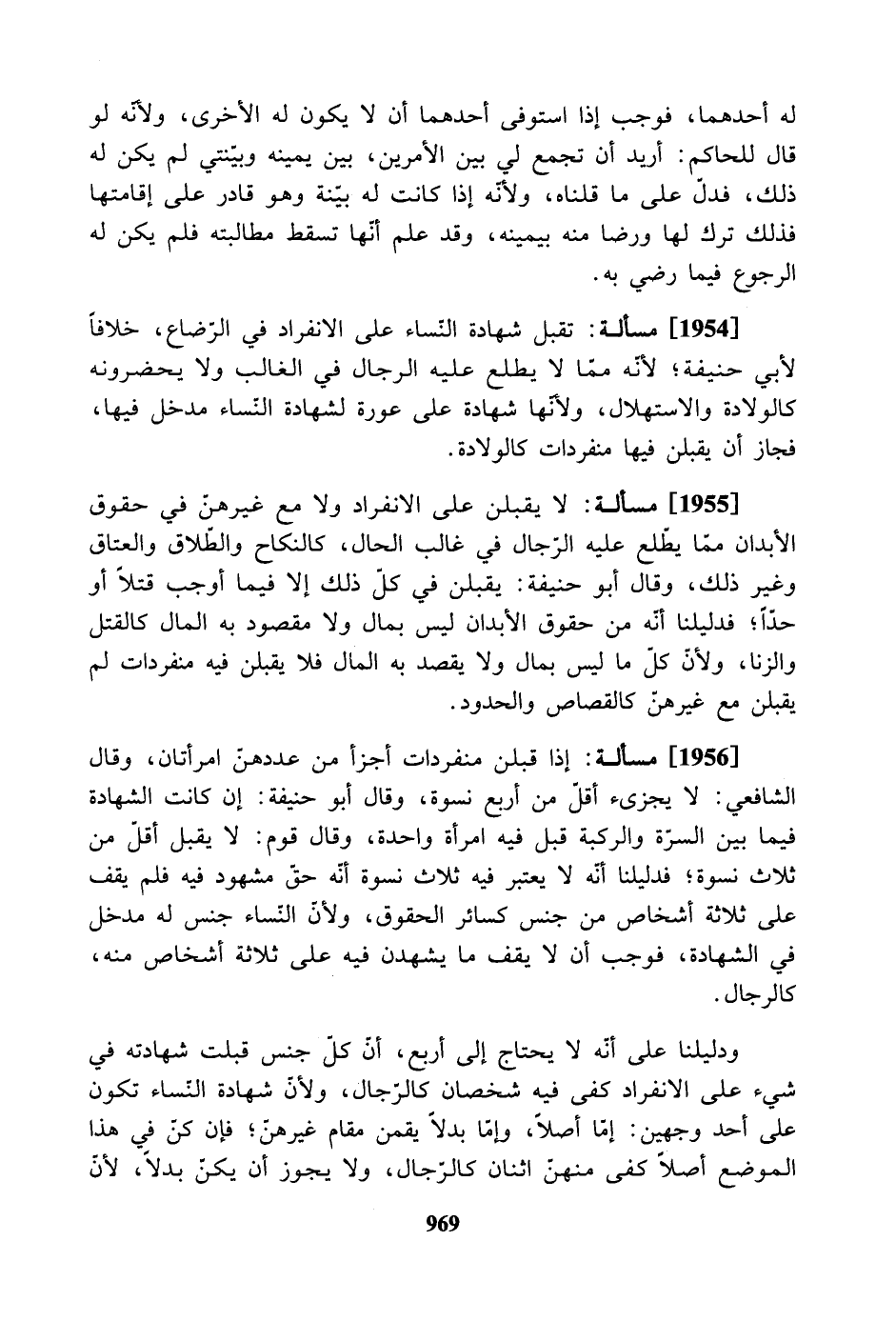 [1955] مسألة: لا يقبلن على الانفراد ولا مع غيرهن في حقوق الأبدان مما يطلع عليه الرجال في غالب الحال، كالنكاح والطلاق والعتاق وغير ذلك، وقال أبو حنيفة: يقبلن في كل ذلك إلا فيما أوجب قتلاً أو حدًّا؛ فدليلنا أنّه من حقوق الأبدان ليس بمال ولا مقصود به المال كالقتل والزنا، ولأن كل ما ليس بمال ولا يقصد به المال فلا يقبلن فيه منفردات لم يقبلن مع غيرهن كالقصاص والحدود.