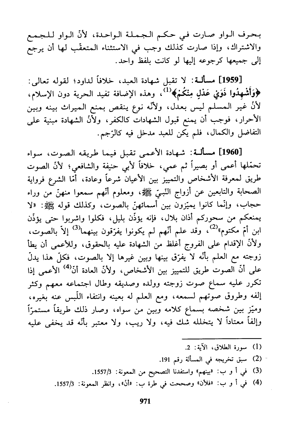 [1959] مسألة: لا تقبل شهادة العبد، خلافاً لداود؛ لقوله تعالى: "وأشهدوا ذوي عدل منكم"، وهذه الإضافة تفيد الحرية دون الإسلام، لأن غير المسلم ليس بعدل، ولأنه نوع ينقص بمنع الميراث بينه وبين الأحرار، فوجب أن يمنع قبول الشهادات كالكفر، ولأنّ الشهادة مبنية على التفاضل والكمال، فلم يكن للعبد مدخل فيه كالرجم.