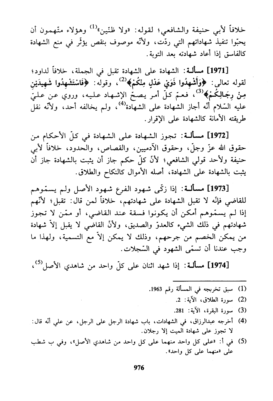[1971] مسألة: الشهادة على الشهادة تقبل في الجملة، خلافاً لداود؛ لقوله تعالى: "وأشهدوا ذوي عدل منكم"، وقوله: "فاستشهدوا شهيدين من رجالكم"، فعم كل أمر يصحّ الإشهاد عليه، وروي عن علي عليه السلام أنه أجاز الشهادة على الشهادة (4،) ولم يخالفه أحد، ولأنه نقلٌ طريقته الأمانة كالشهادة على الإقرار.