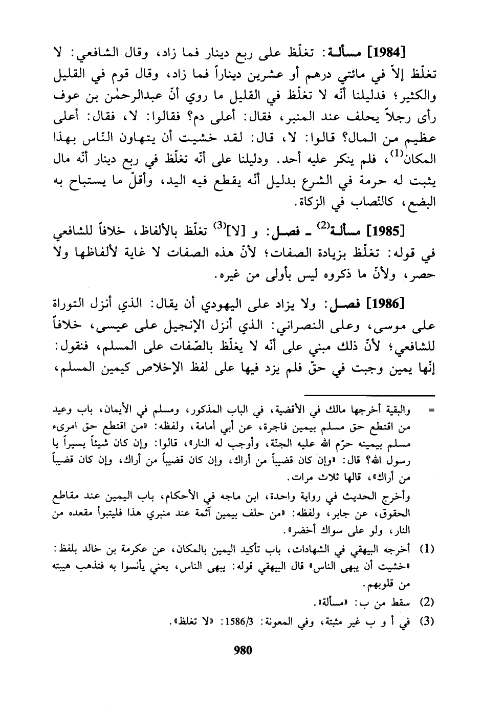 [1985] مسألة - فصل: و [لا] تغلَّظ بالألفاظ، خلافاً للشافعي في قوله: تغلّظ بزيادة الصفات؛ لأن هذه الصفات لا غاية لألفاظها ولا حصر، ولأنّ ما ذكروه ليس بأولى من غيره.