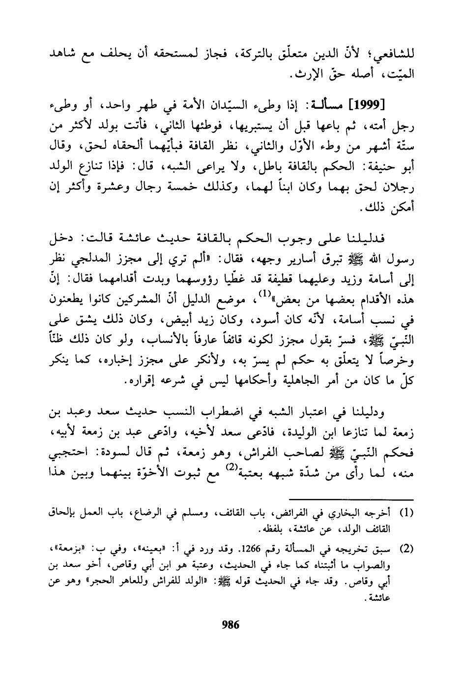 ودليلنا في اعتبار الشبه في اضطراب النسب حديث سعد وعبد بن زمعة لما تنازعا ابن الوليدة، فادعى سعد لأخيه، وادعى عبد بن زمعة لأبيه، فحكم النبي صلى الله عليه وسلم لصاحب الفراش، وهو زمعة، ثم قال لسودة: احتجبي منه، لما رأى من شدة شبهه بعتبة مع ثبوت الأخوة بينهما وبين هذا