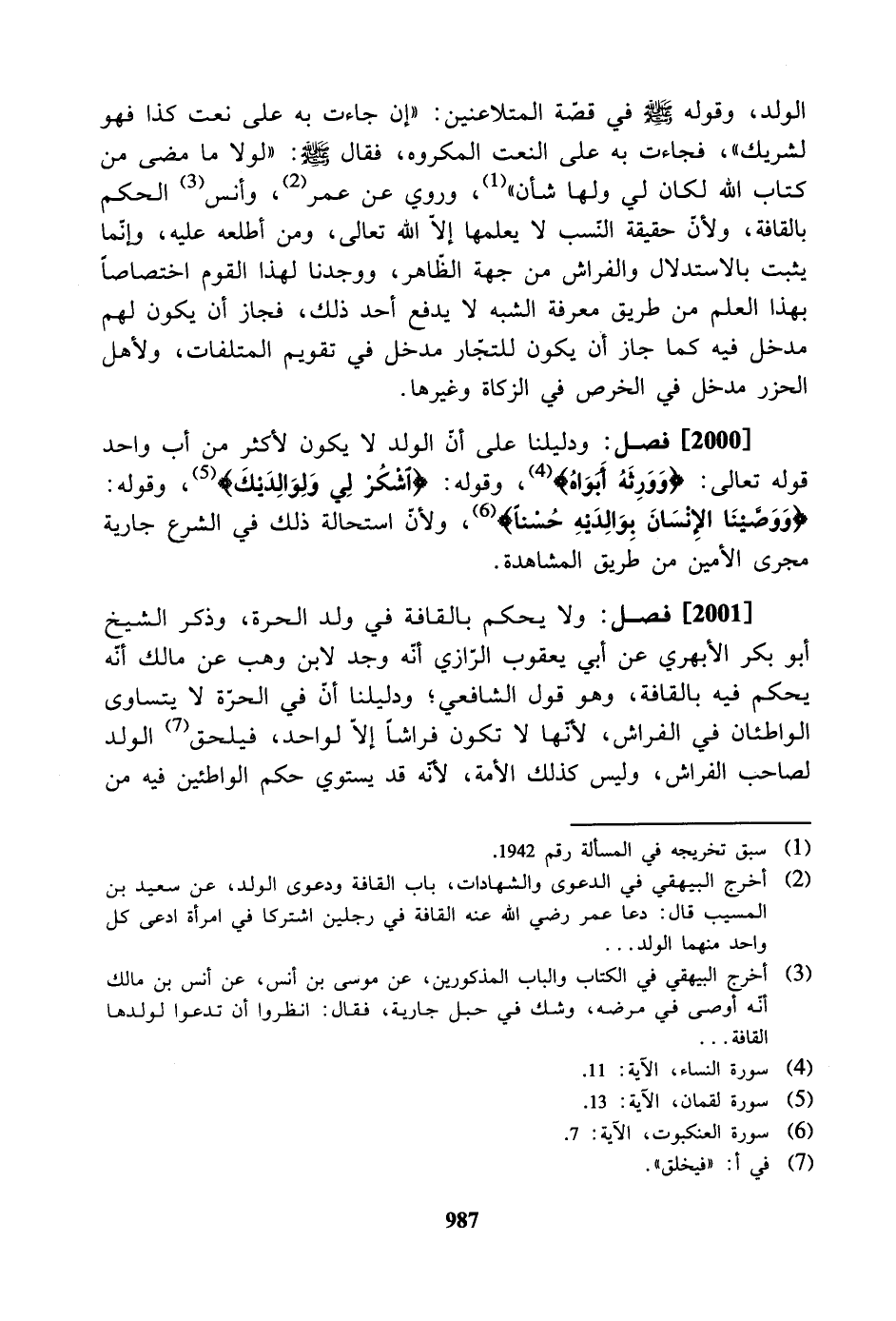 الولد، وقوله صلى الله عليه وسلم في قصة المتلاعنين: «إن جاءت به على نعت كذا فهو لشريك»، فجاءت به على النعت المكروه، فقال صلى الله عليه وسلم: «لولا ما مضى من كتاب الله لكان لي ولها شأن»، وروي عن عمر، وأنس الحكم بالقافة، ولأن حقيقة النسب لا يعلمها إلا الله تعالى، ومن أطلعه عليه، وإنّما يثبت بالاستدلال والفراش من جهة الظاهر، ووجدنا لهذا القوم اختصاصاً بهذا العلم من طريق معرفة الشبه لا يدفع أحد ذلك، فجاز أن يكون لهم مدخل فيه كما جاز أن يكون للتجار مدخل في تقويم المتلفات، ولأهل الحزر مدخل في الخرص في الزكاة وغيرها.