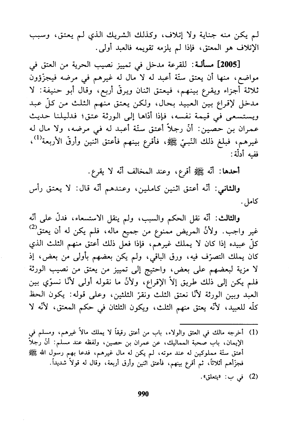 [2005] مسألة: للقرعة مدخل في تمييز نصيب الحرية من العتق في مواضع، منها أن يعتق ستة أعبد له لا مال له غيرهم في مرضه فيجزؤون ثلاثة أجزاء ويقرع بينهم، فيعتق اثنان ويرق أربع، وقال أبو حنيمة: لا مدخل لإقراع بين العبيد بحال، ولكن يعتق منهم الثلث من كل عبد ويستسعى في قيمة نفسه، فإذا أداها إلى الورثة عتق؛ فدليلنا حديث عمران بن حصين: أن رجلاً أعتق ستة أعبد له في مرضه، ولا مال له غيرهم، فبلغ ذلك النبى صلى الله عليه وسلم، فأقرع بينهم فأعتق اثنين وأرق الأربعة، ففيه أدلة: