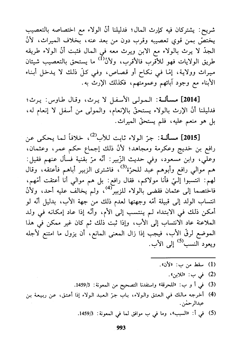 [2015] مسألة: جر الولاء ثابت للأب، خلافاً لما يحكى عن رافع بن خديج وعكرمة ومجاهد؛ لأن ذلك إجماع حكم عمر، وعثمان، وعلي، وابن مسعود، وفي حديث الزبير: أنه مر بقنية فسأل عنهم فقيل: هم موالي رافع وأبوهم عبد للحرة، فاشترى الزبير أباهم فأعتقه، وقال لهم: انتسبوا إلي فأنا مولاكم، فقال رافع: بل هم موالي أنا أعتقت أمهم، فاختصما إلى عثمان فقضى بالولاء للزبير، ولم يخالف عليه أحد، ولأن انتساب الولد إلى قبيلة أمه وجهتها لعدم ذلك من جهة الأب، بدليل أنه لو أمكن ذلك في الابتداء لم ينتسب إلى الأم، وأنّه إذا عاد إمكانه في ولد الملاعنة عاد الانتساب إلى الأب، وإذا ثبت ذلك ثم كان غير ممكن في هذا الموضع لرق الأب، فيجب إذا زال المعنى المانع، أن يزول ما امتنع لأجله ويعود النسب إلى الأب.