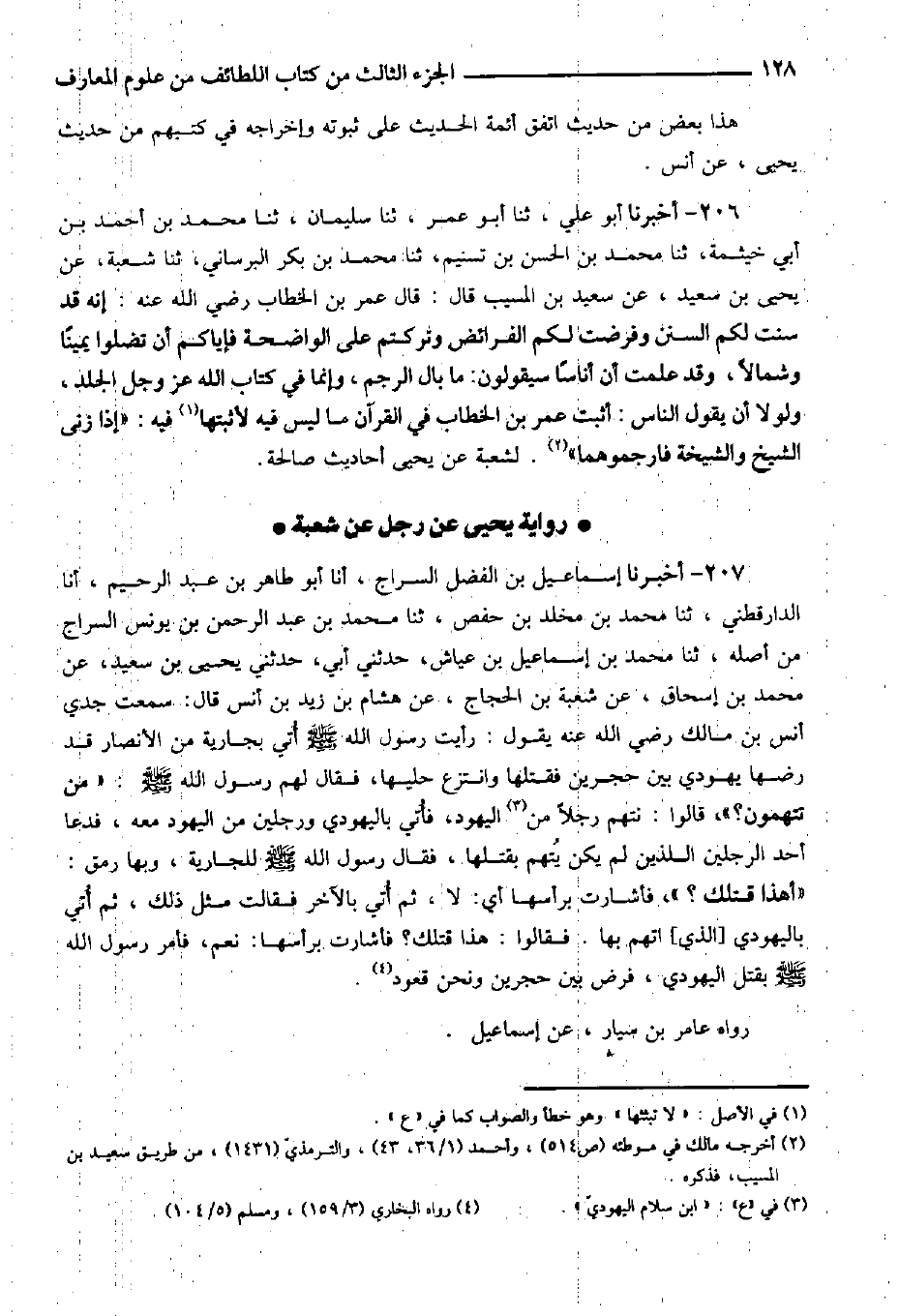 197- أخبرنا إسماعيل بن الفضل، أنا أبو طاهر، أنا الدارقطني، ثنا الحسين بن صفوان البرذعي، ثنا جعفر بن أحمد بن الخليل، (ح) قال الدارقطني: وحدثنا عبد الرحمن بن الحسن القاضي الهمذاني، ثنا محمد بن أيوب الرازي قالا: ثنا محمود بن غيلان، ثنا شبابة، ثنا شعبة، عن مالك بن أنس، عن نافع، عن ابن عمر رضي الله عنهما قال: كانت قائمة سيف عمر رضي الله عنه فضة، قال: وكان ابن عمر يتقلده.