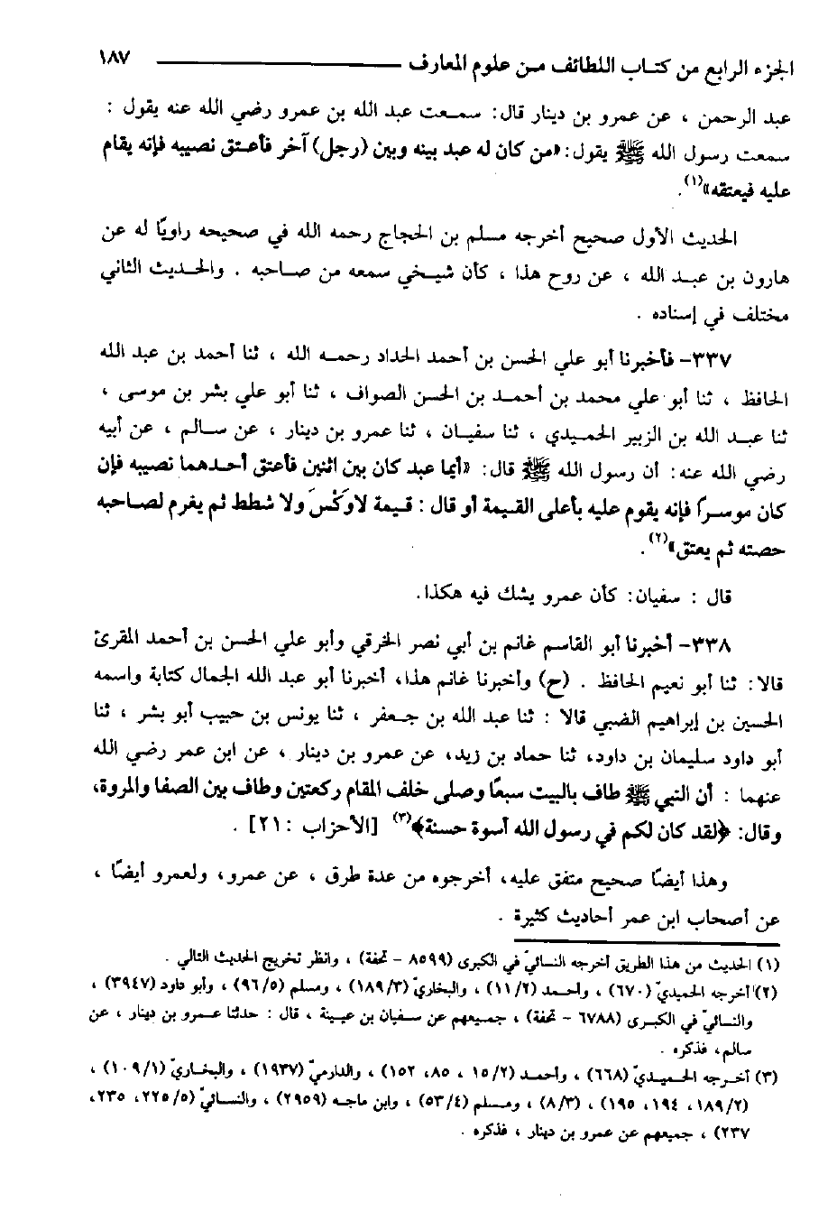 323- أخبرنا الرئيس أبو القاسم هبة الله بن محمد بن عبد الواحد بن الحصين الشيباني رحمه الله ببغداد، أنا أبو علي الحسن بن علي بن المذهب الواعظ، ثنا أبو بكر أحمد بن جعفر بن حمدان القطيعي، ثنا أبو عبد الرحمن عبد الله بن أحمد، حدثني أبي أحمد بن حنبل رحمه الله، ثنا حجاج، ثنا الليث، ثنا سعيد بن أبي سعيد، عن أبي عبيدة، عن سعيد بن يسار: أنه سمع أبا هريرة رضي الله عنه يقول: قال رسول الله صلى الله عليه وسلم نحوه. وقبله عن النبي صلى الله عليه وسلم أنه قال: ((لا يوطن رجل مسلم المساجد للصلاة إلا تبشبش الله تبارك وتعالى به حتى يخرج من بيته كما يتبشبش أهل الغائب بغائبهم إذا قدم)) .