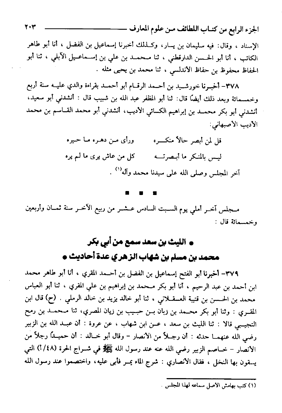 363- أخبرنا إسماعيل بن الفضل بن الإخشيد، ثنا أبو المظفر عبد الله بن شبيب بن عبد الله المقري إملاءً، أخبرنا أبو الحسن بن الحمامي، ثنا أحمد بن جعفر بن سلم الختلي، ثنا أبو علي عبيد الله بن جعفر الرازي، أنشدنا [أبو] العباس إسماعيل بن علويه لابن عروس في الناصر لدين الله: