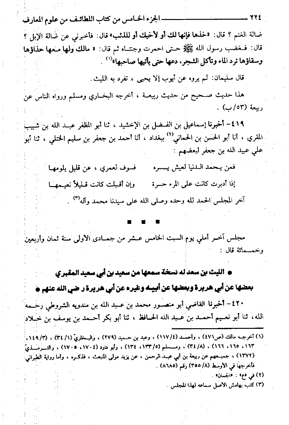 400- أخبرنا أحمد بن علي بن موسى أبو بكر المؤدب رحمه الله، أنا أبو الطيب عبد الرزاق بن عمر بن موسى، أنا أبو بكر بن المقري إذناً، ثنا محمد بن الحسن بن قتيبة، ثنا محمد بن رمح، ثنا الليث، عن يحيى بن عبد الله بن سالم بن عبد الله بن عمر: أن عبد الله بن عمر بن حفص بن عاصم بن عمر حدثه، عن نافع، عن ابن عمر: أن عمر بن الخطاب رضي الله عنه حين هلك أسيد بن الحضير رضي الله عنه وقام غرماؤه بماله سأل عمر: في كل يؤدي من ثمرة ماله ما عليه من الدين؟ فقيل: في أربع سنين. فقال لغرمائه: ما عليكم أن لا يباع، فإني أكفيكم وإنما تقضون في أربع سنين. قال فرضوا بذلك. فأقر المال لهم ولم يكن باع ثمار نخل أسيد أربع سنين من عبد الرحمن بن عوف رضي الله عنه، ولكنه وضعه على يدي عبد الرحمن بن عوف للغرماء.