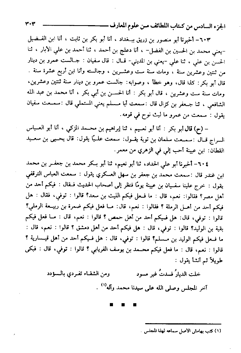 587- قرأت على عبد الواحد بن حمد أبي المظفر المقري رحمه الله: أخبركم أحمد بن الفضل المقري إذناً، حدثنا أبو القاسم علي بن عمر الهمداني، ثنا أبو أحمد بن عدي قال: سمعت الحسن بن سفيان يقول: سأل أصحاب الحديث الزيادة من علي بن حجر فأنشأ يقول: