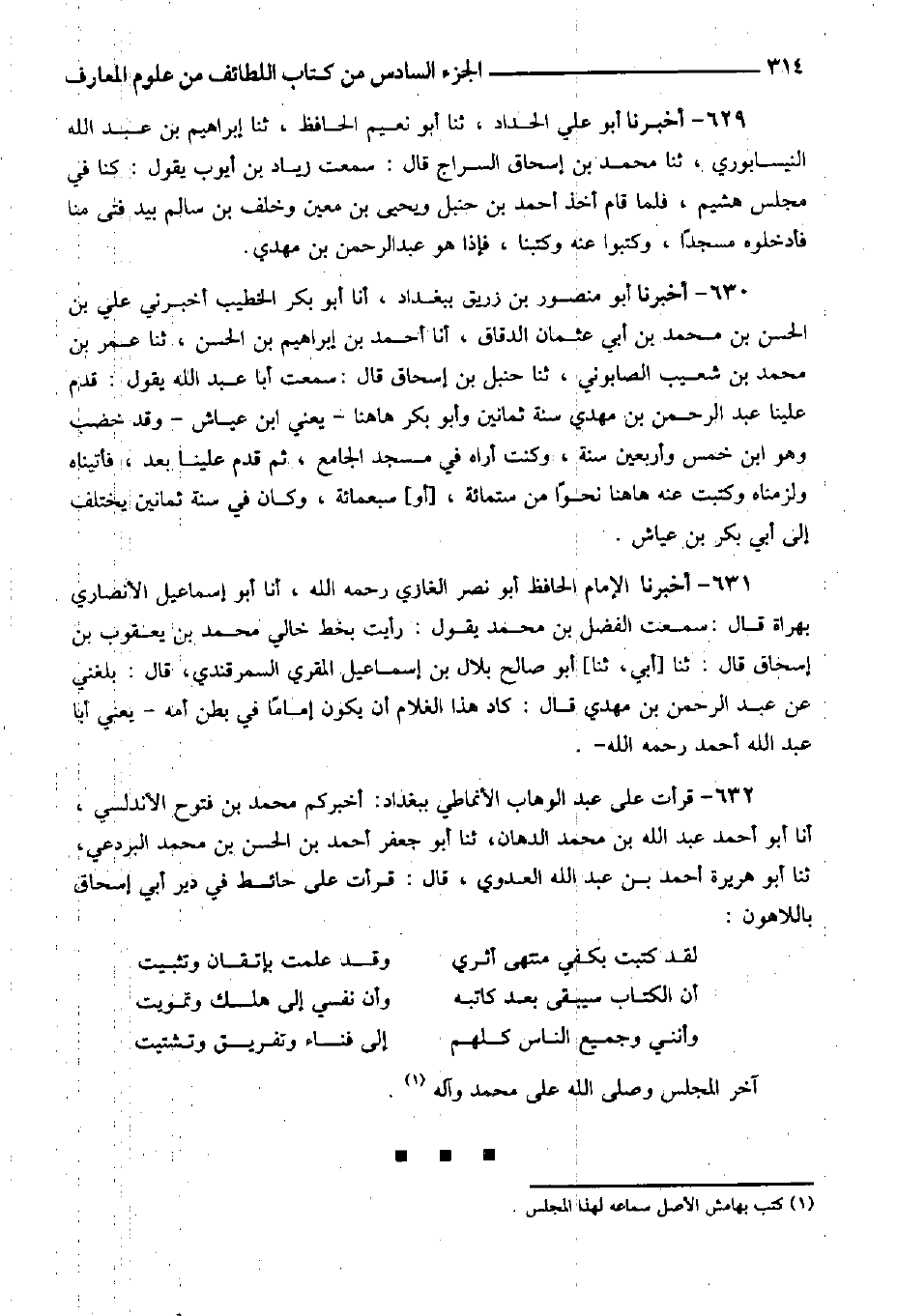 610- أخبرنا أبو منصور محمد بن عبد الله بن مندويه، ثنا أبو نعيم الحافظ، ثنا أبو بكر بن خلاد، ثنا الحارث بن أبي أسامة، ثنا يونس بن محمد، ثنا ليث، عن أبي الزبير، عن جابر رضي الله عنه قال: أقبلنا مع رسول الله صلى الله عليه وسلم مهلين بالحج مفرداً وأقبلت عائشة رضي الله عنه مهلة بعمرة حتى إذا كانت بسرف عركت، حتى إذا قدمنا طفنا بالكعبة وبالصفا والمروة وأمرنا رسول الله صلى الله عليه وسلم أن يحل منا من لم يكن معه هدي قال: فقلنا حل ماذا؟ قال: الحل كله، قال: فواقعنا النساء وتطيبنا بالطيب، وليس بيننا وبين عرفة إلا أربع ليال، ثم أهللت يوم التروية، ثم دخل رسول الله صلى الله عليه وسلم على عائشة فوجدها تبكي فقال: ((ما شأنك)) قالت: شأني أني قد حضت، وقد حل الناس ولم أحلل ولم أطف بالبيت والناس يذهبون إلى الحج الآن قال: ((فإن هذا أمر كتبه الله تعالى على بنات آدم، فاغتسلي ثم أهلي بحج)) ففعلت ووقفت الموقف حتى إذا طهرت طافت بالكعبة وبالصفا والمروة ثم قال: ((قد حللت من حجك وعمرتك جميعاً)) فقالت: يا رسول الله إني أجد في نفسي إن لم أطف بالبيت حتى حججت قال: ((فاذهب بها يا عبد الرحمن بن أبي بكر فأعمرها من التنعيم وذلك ليلة الحصبة)) .