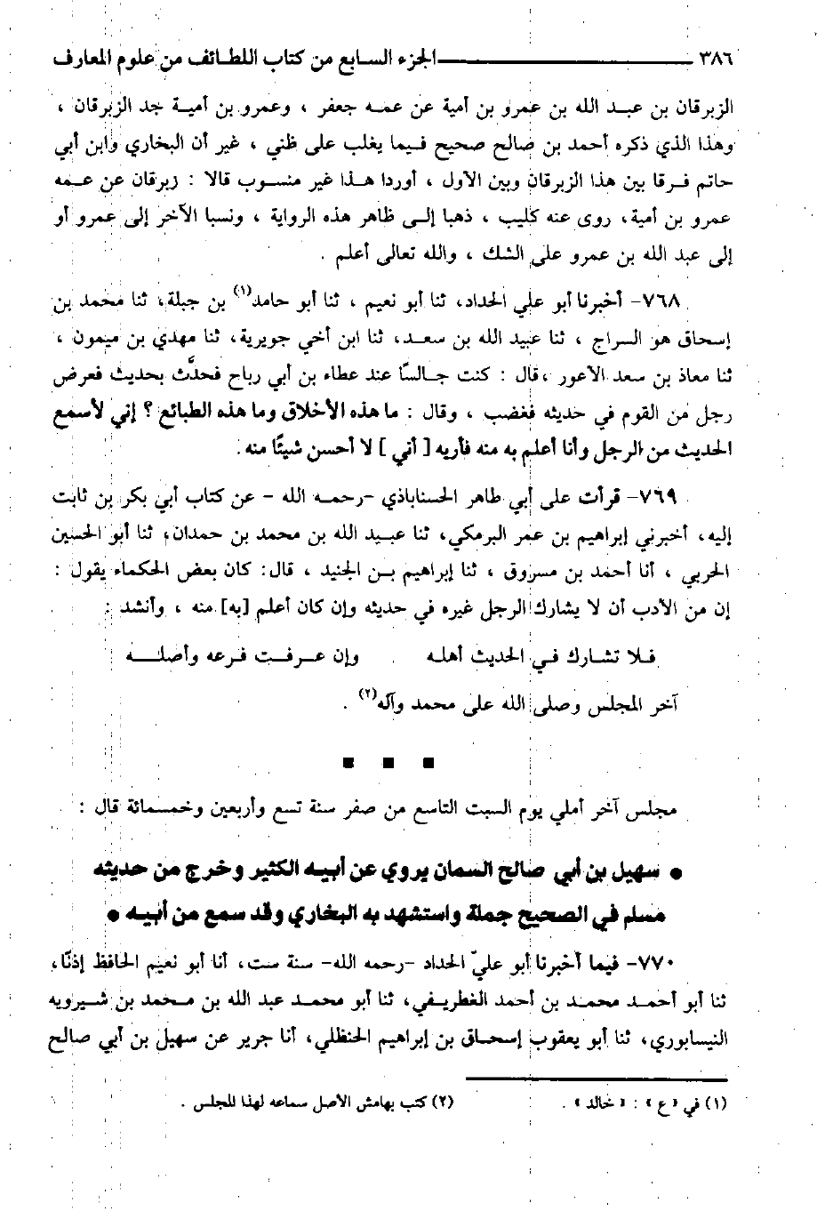 751- فيما قرأته على عمر بن محمد بن عمر أبي الخير المعدل -رحمه الله-، أنا أبو منصور وأبو ريذة ابنا أبي الحسن [الصوفي] قالا: أنا محمد بن إسحاق: أنا محمد بن نافع، ثنا محمد بن أحمد بن حماد، ثنا موسى بن سهل، ثنا أبو شبيب أبان بن السري: حدثني سليمان بن الجعد مولى الفرع: حدثني أبوك السري بن عبد الرحمن -وكان وصي الفارعة-: أن الفارعة بنت عبد الرحمن بن المنذر بن زهير كانت تقول عن أبيها: أن جدها زهير بن علقمة من أصحاب النبي صلى الله عليه وسلم -وكانت كبشة أخت زهير تحت معاوية رضي الله -[378]- عنه- ولا أراها ذكرته إلا عن أبيها عن جدها.